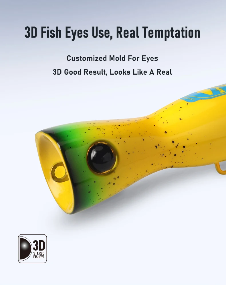 - Las bocas anchas y cóncavas crean fuertes sonidos de "bucle" o "puchero" para imitar a los peces de cebo desgastados, provocando golpes agresivos de GT.