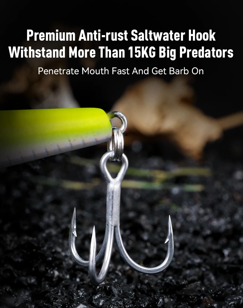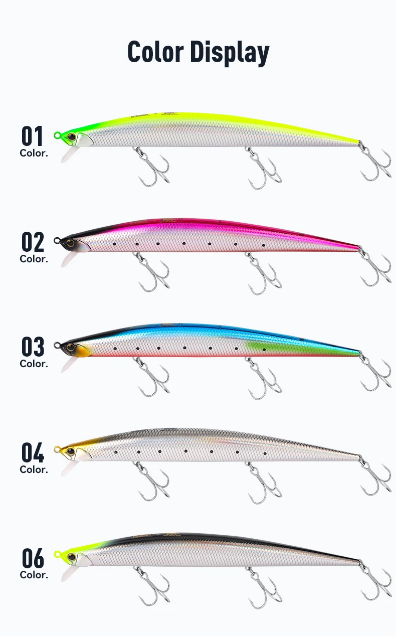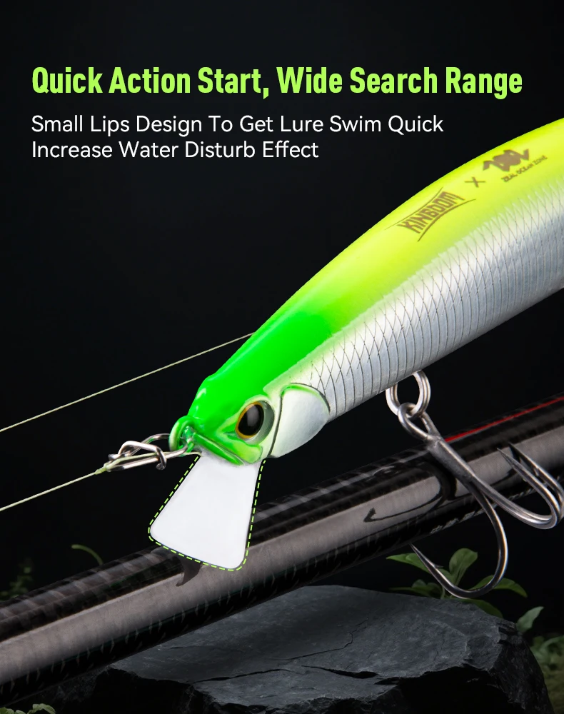 -Acción amplia y oscilante: la forma del pececillo, combinada con un labio de buceo, crea una oscilación apretada y una amplia acción de natación "S" que imita un pez lesionado o fugaz.Esta acción crea vibraciones en el agua que los depredadores pueden detectar con su línea lateral.