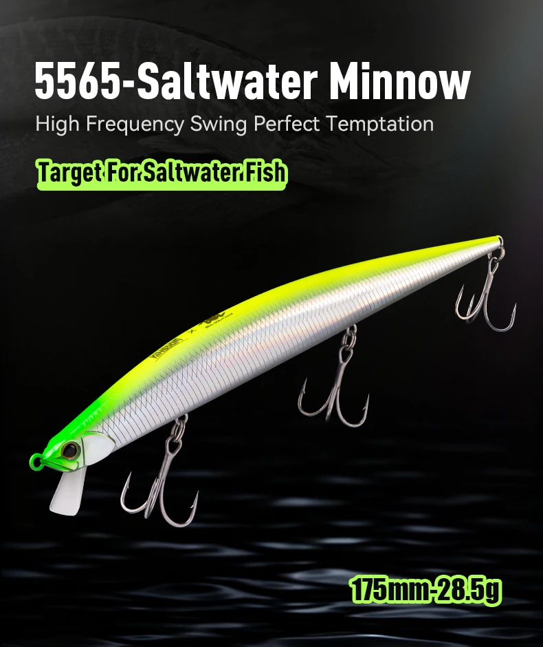 1) Recuperación recta: Minnow presentó un cebo para nadar sano y con confianza.Adecuado para su uso cuando los peces tienen una alta actividad y necesitan buscar rápidamente grandes áreas de agua.