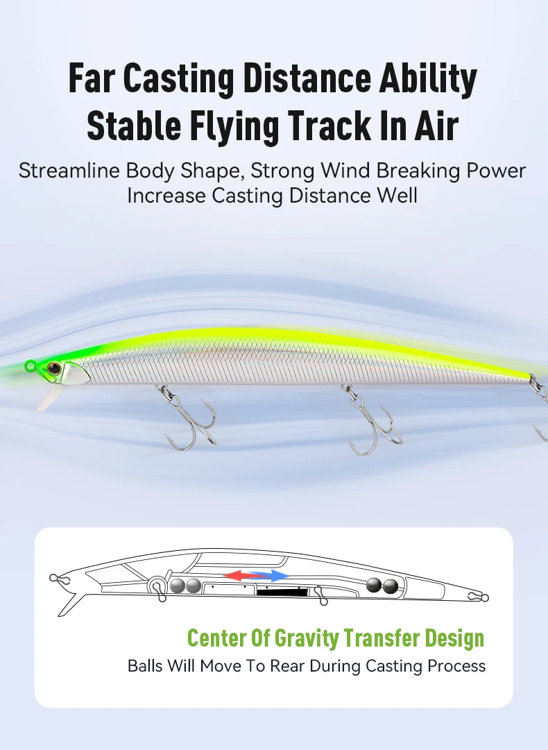 -Al lanzar, las bolas de acero se mueven hacia atrás, el centro de gravedad también se mueven hacia la cola del cebo y aumentan la distancia de lanzamiento.