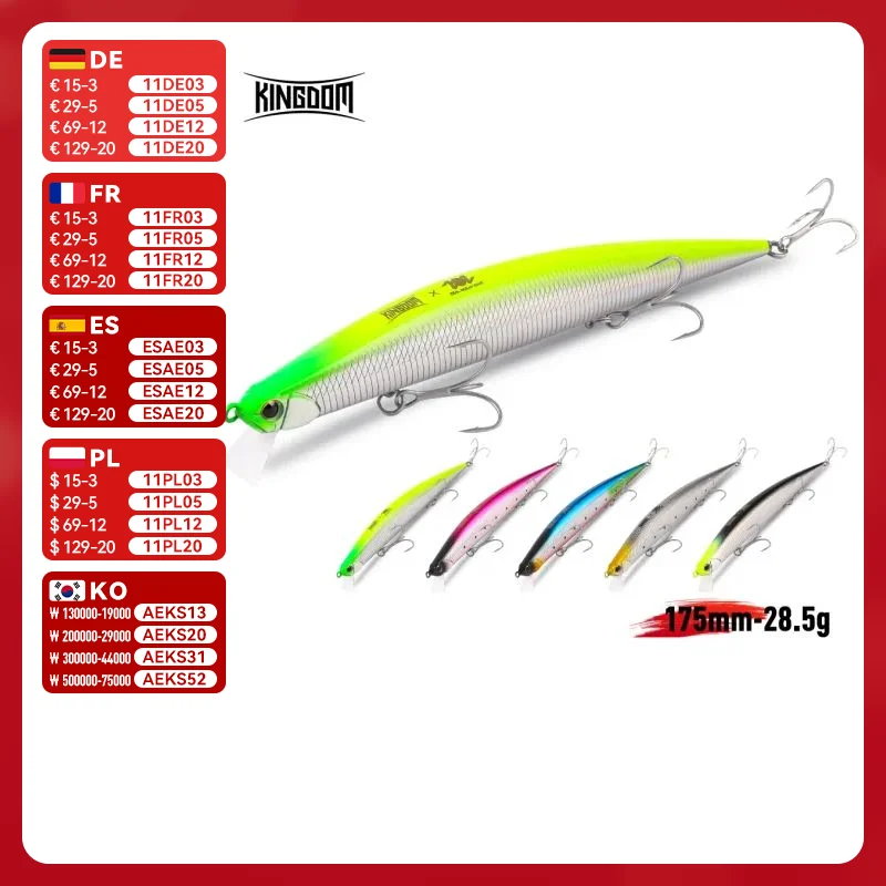 Kingdom Minnow Señuelo de Pesca 28,5g 175mm Hundimiento Largo Casting Cebos de Pesca Artificial Cebo Baja Truta Lucio Agua Dulce Salada