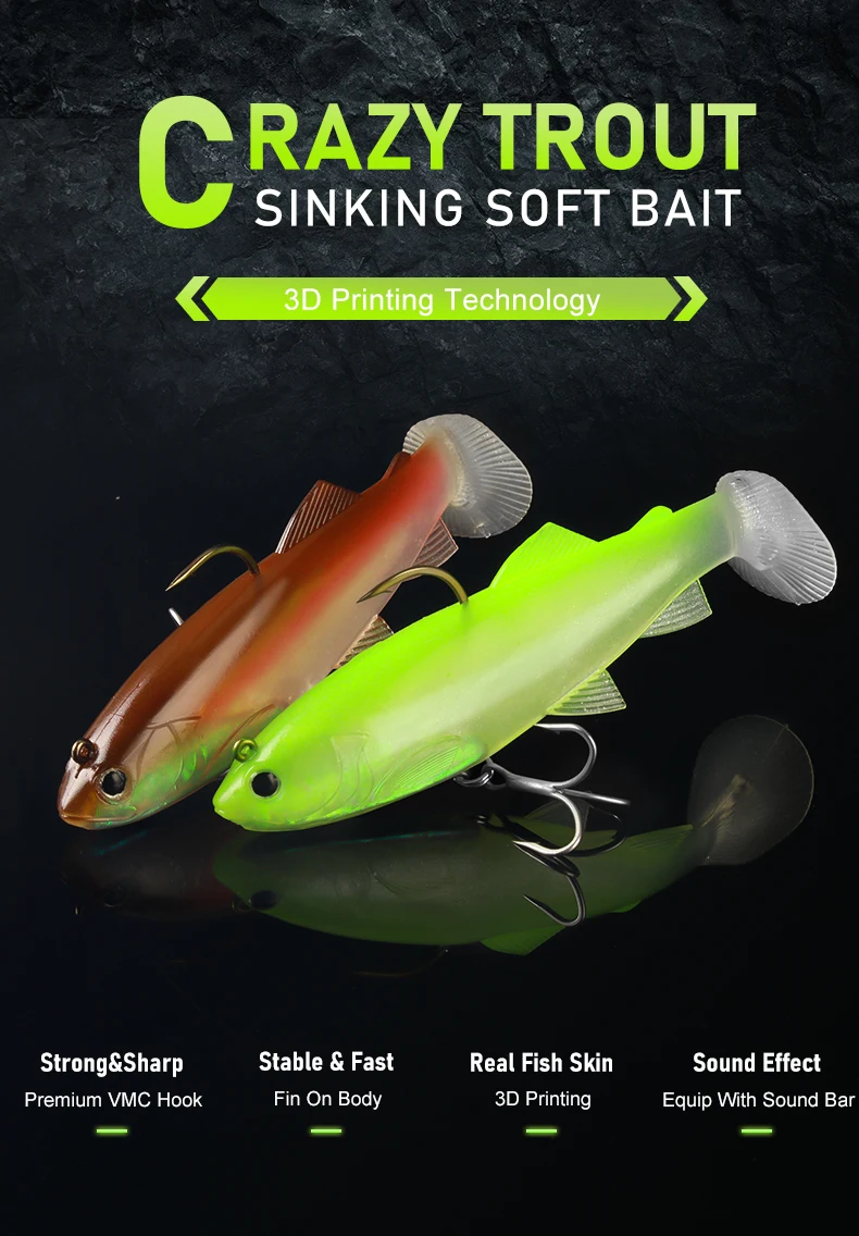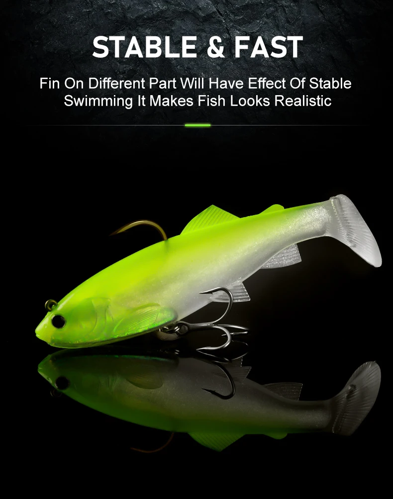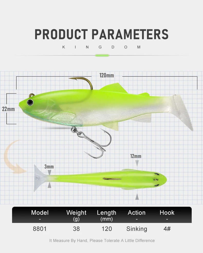 Kingdom-señuelo de pesca suave, 38g, 120mm, cola en T Artificial, cebo de silicona, anzuelos triples, Swimbait Wobblers, aparejos de Pesca para lubina