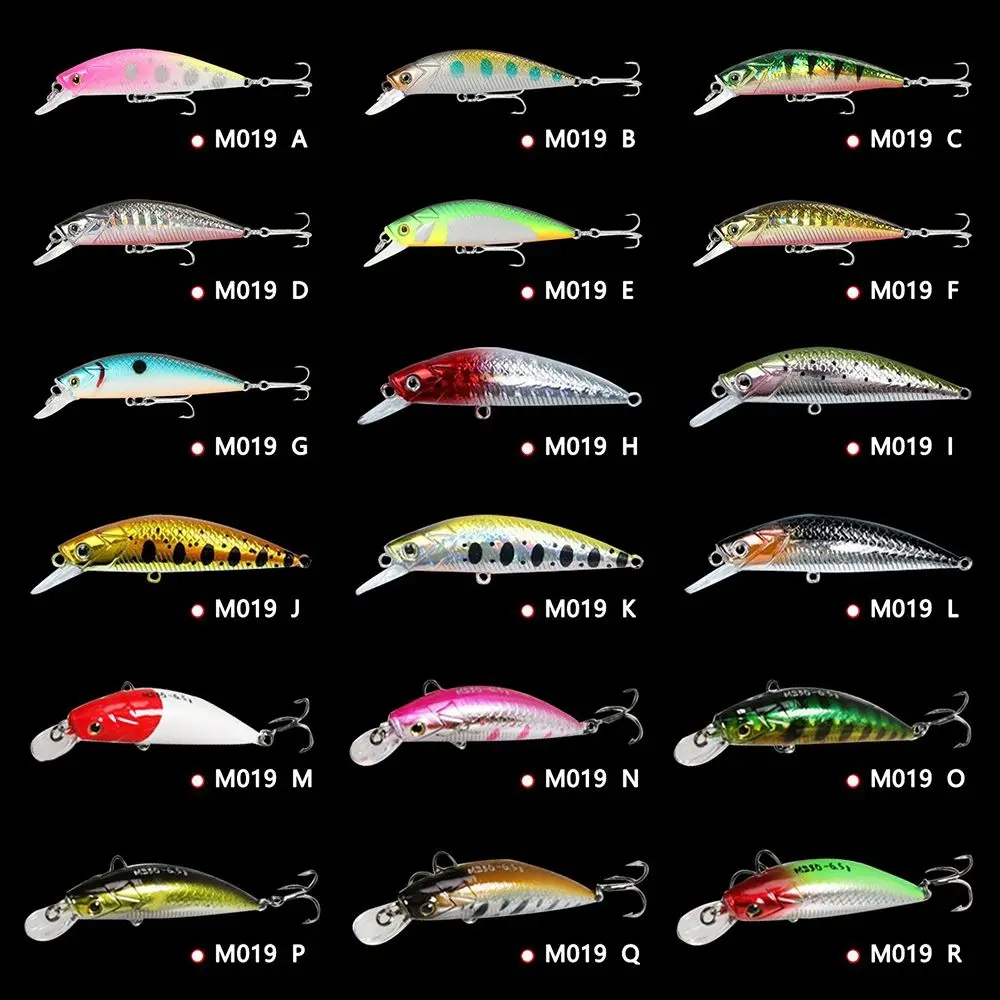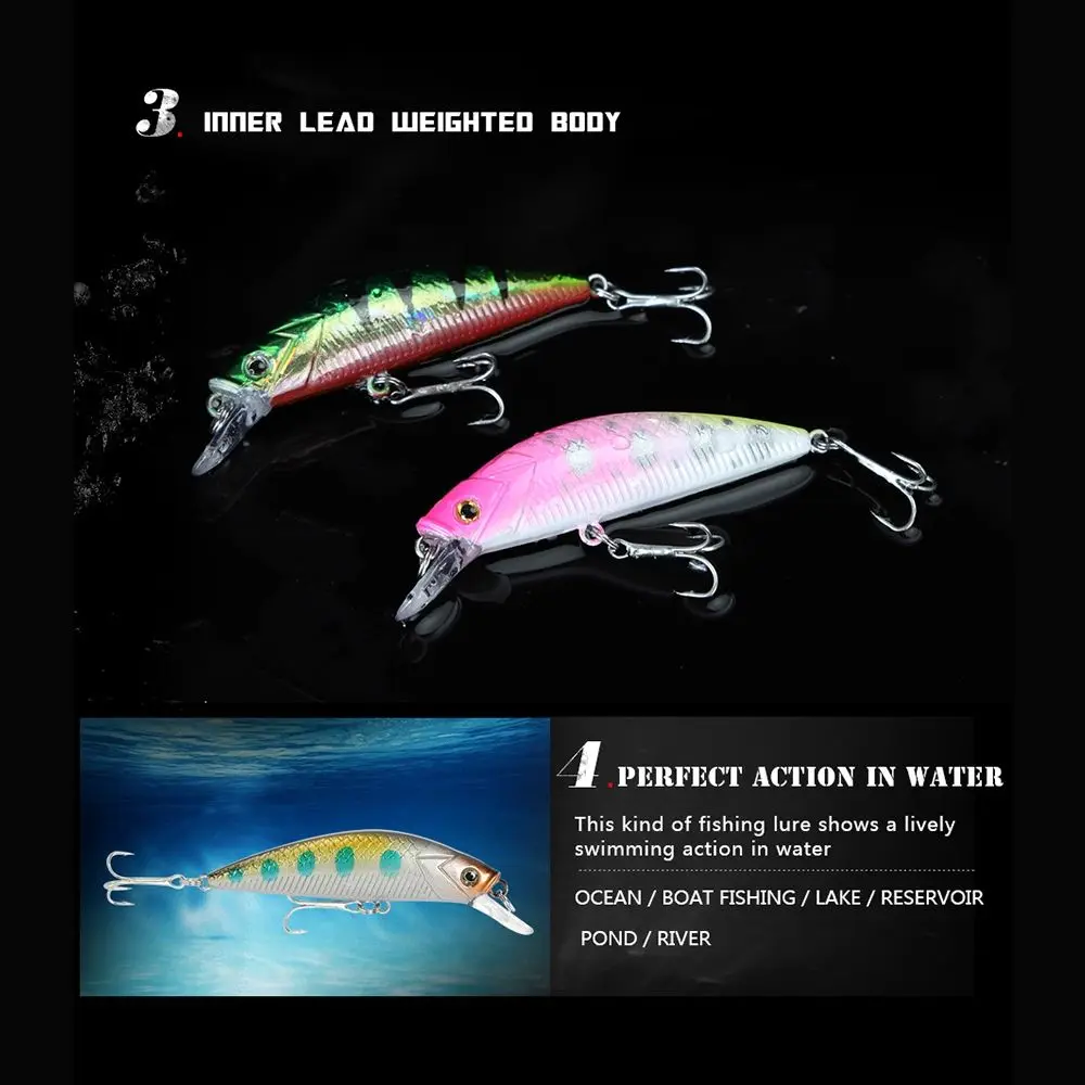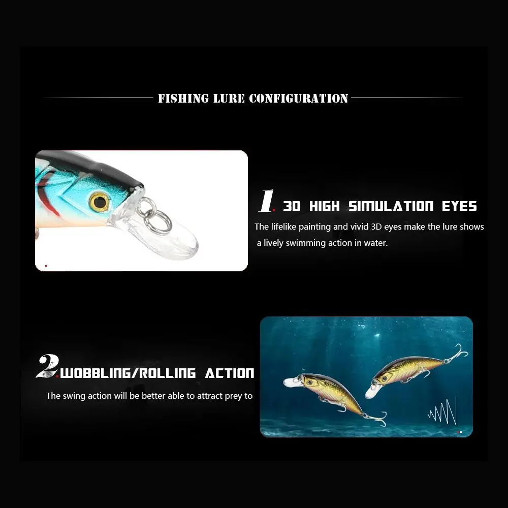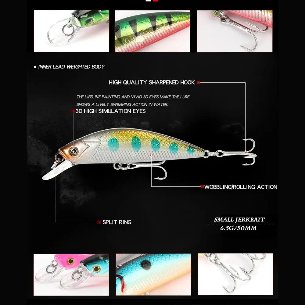 Modelo del señuelo: señuelo de pececillo de doble anzuelo Tipo de señuelo: señuelo de pesca duro Peso del señuelo: 5,8g Longitud del señuelo: 55mm Anzuelos: Equipado con 2 anzuelos anticorrosión de La piezas Ojos: Ojos de pez 3D Colores: 18 colores Características del producto: 1. Material: plástico ABS, ojo de pez de simulación 3D, tres ganchos. 2. Los ojos 3D lo convierten en una herramienta perfecta para los entusiastas de la pesca. 3. El cuerpo colorido puede hacer que los peces sean fáciles de atrapar. 4. Vida útil y acción rápida. 5. Excelente efecto visual para atraer peces. 6. Este Tipo de cebo tendrá una acción de natación animada en el agua, lo que atraerá la atención y el ataque de los peces. El paquete incluye: 1 cebos Minnow
