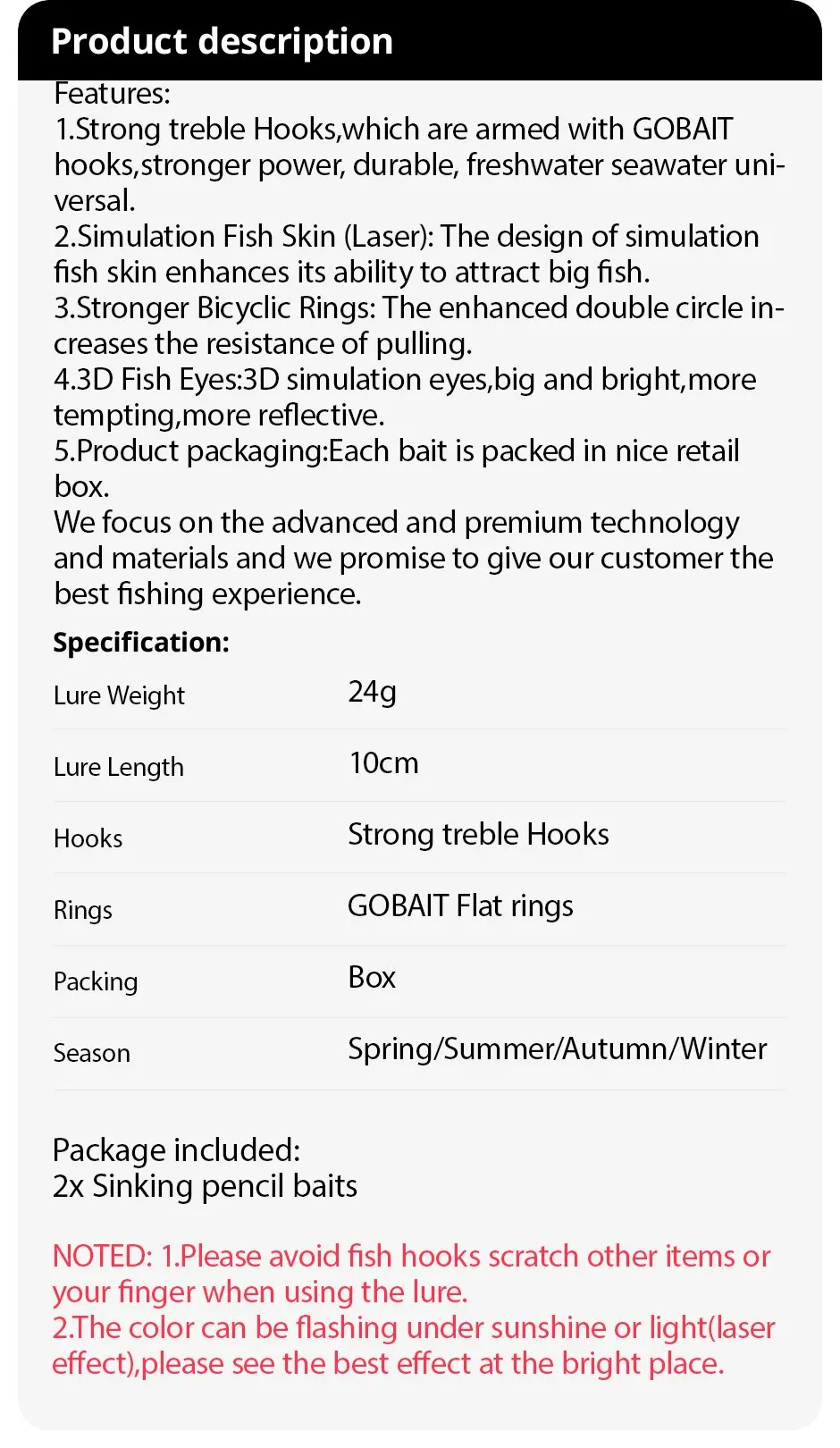 Aviso: 1. Por favor evite los anzuelos rascarse otros artículos o su dedo cuando se utiliza el señuelo.