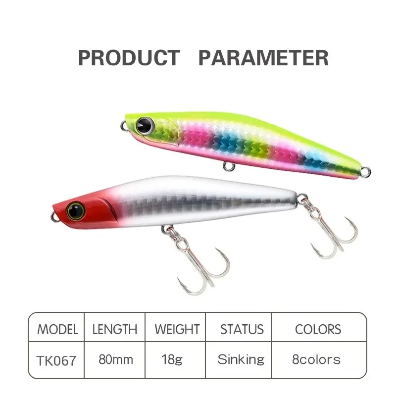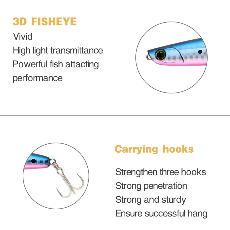 6.Bolas de metal: bolas de acero inoxidable en el interior, para mantener el equilibrio del señuelo de pesca, para lanzar a distancia más lejana.7.Anillos bicíclicos más fuertes: fortalecen el doble círculo y aumentan la resistencia al tirón.