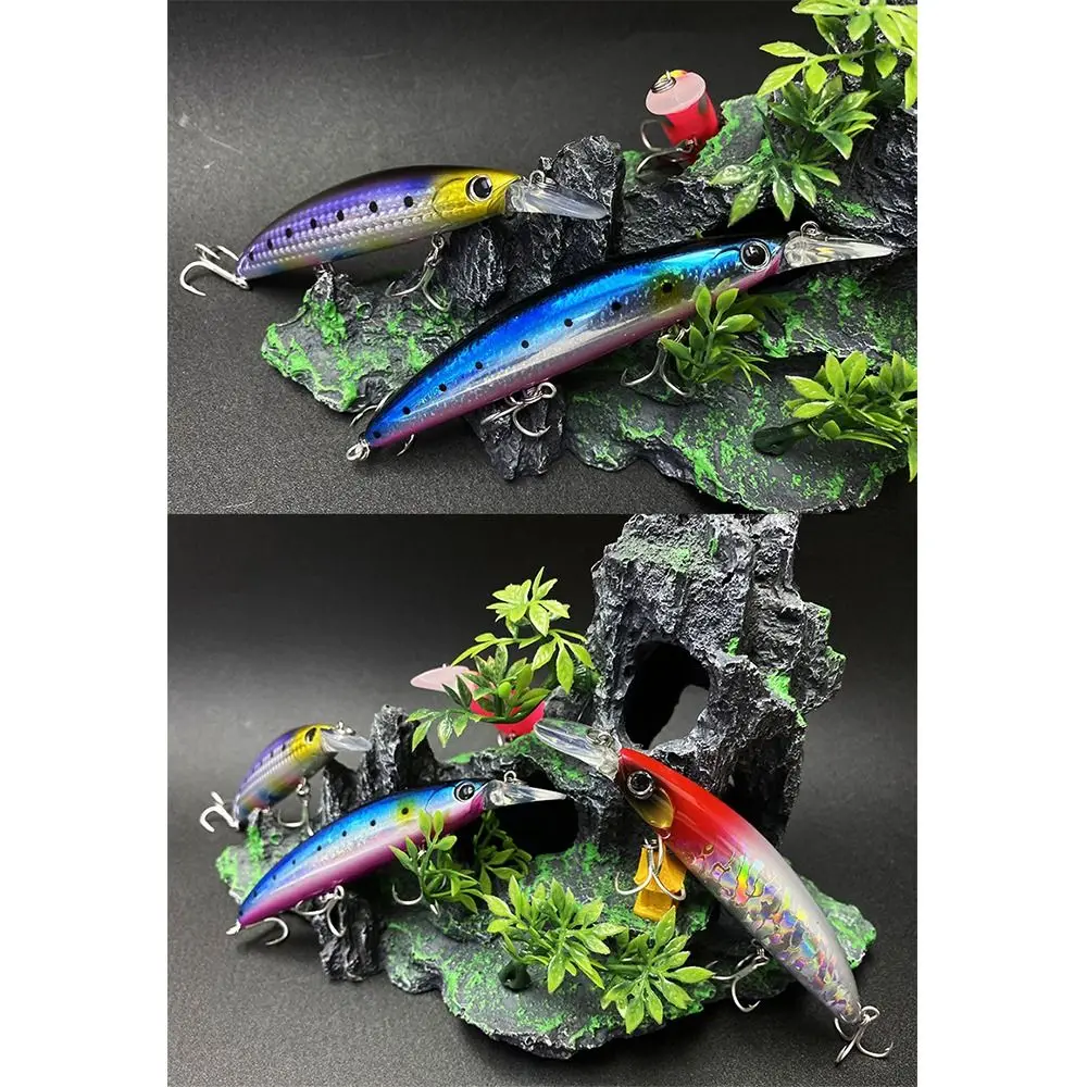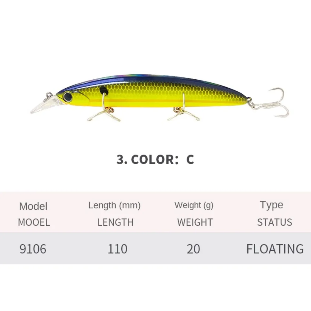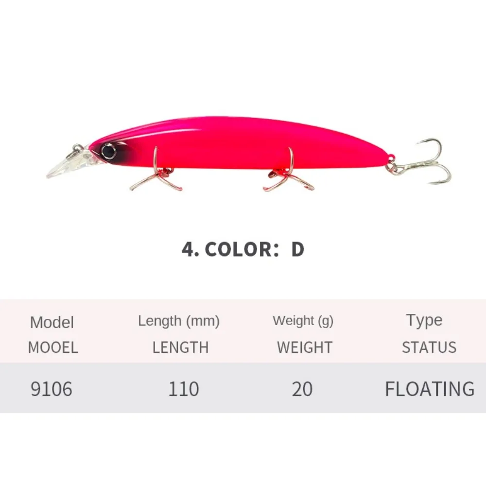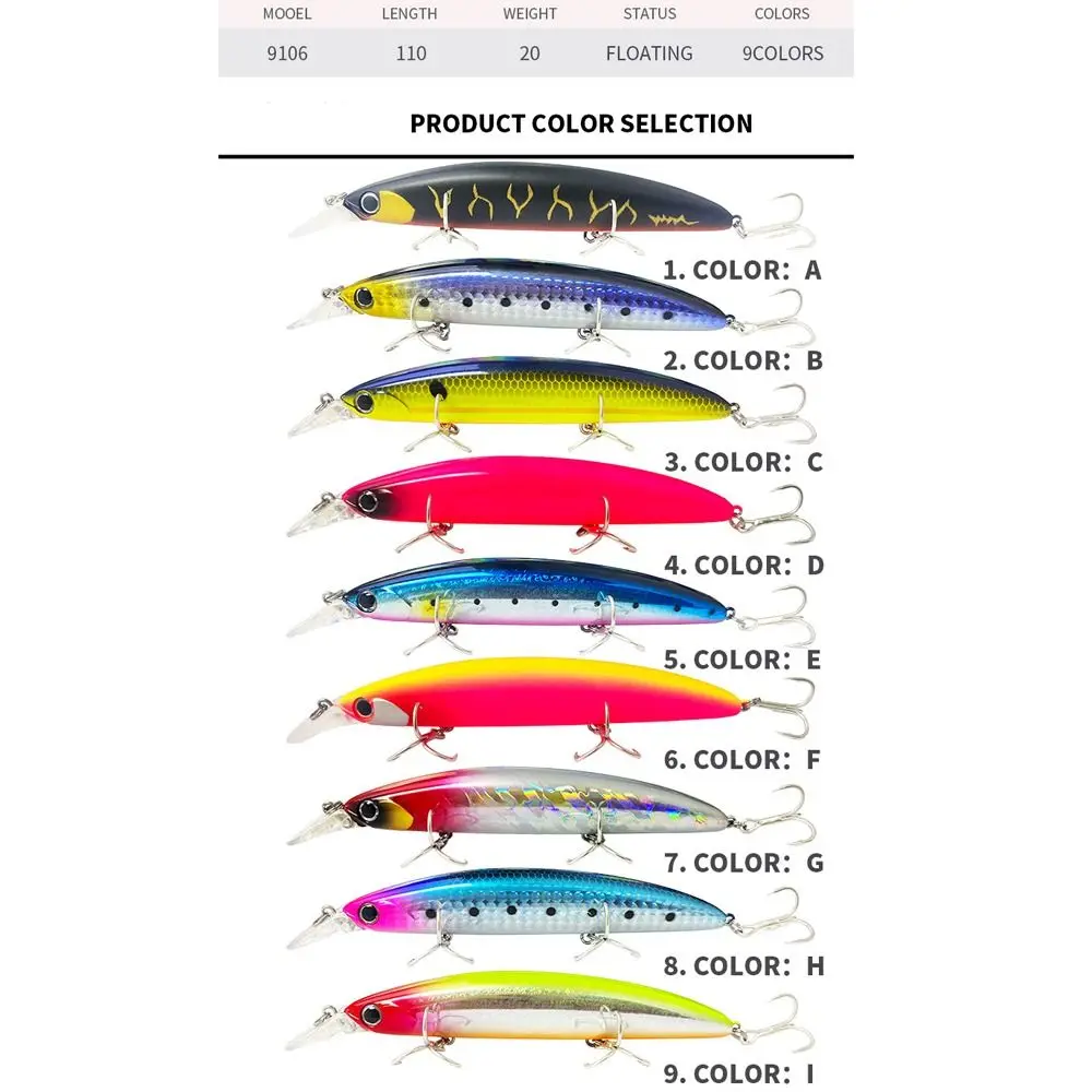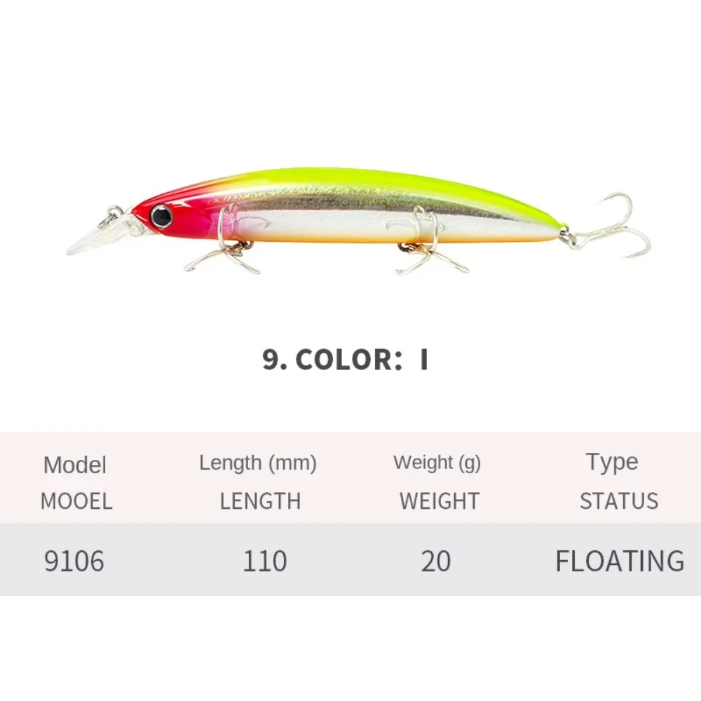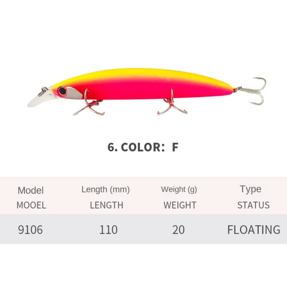 Tipo de señuelo: señuelo de pesca duro Tamaño del señuelo: como muestra la imagen Longitud: como muestra la imagen Flotabilidad: hundimiento Cebos de pesca Anzuelos: 2 anzuelos VMC Ojos equipados: ojos de pez 3D Anillos: bicíclico Longitud: 110mm Peso: 20g Paquete incluido: 1 señuelo de pesca