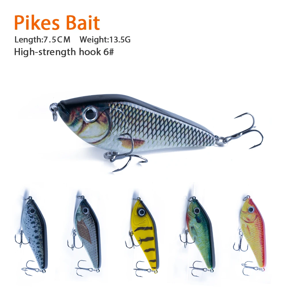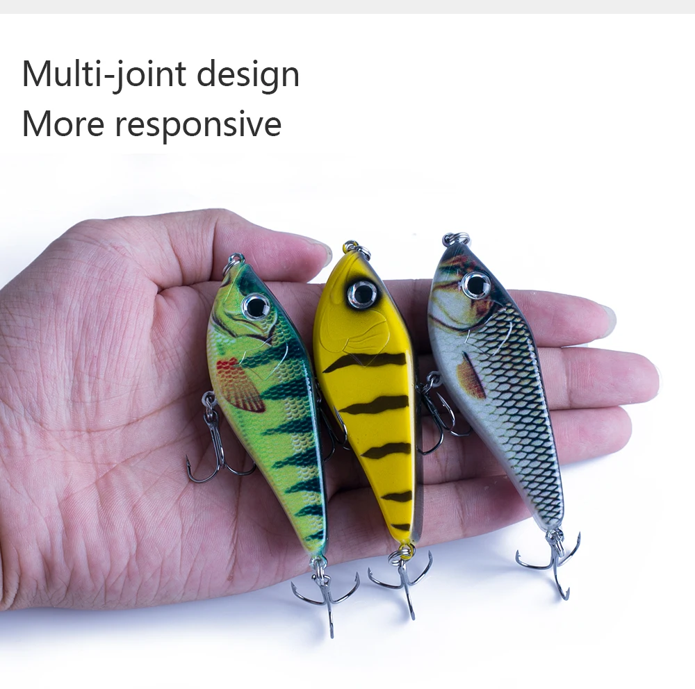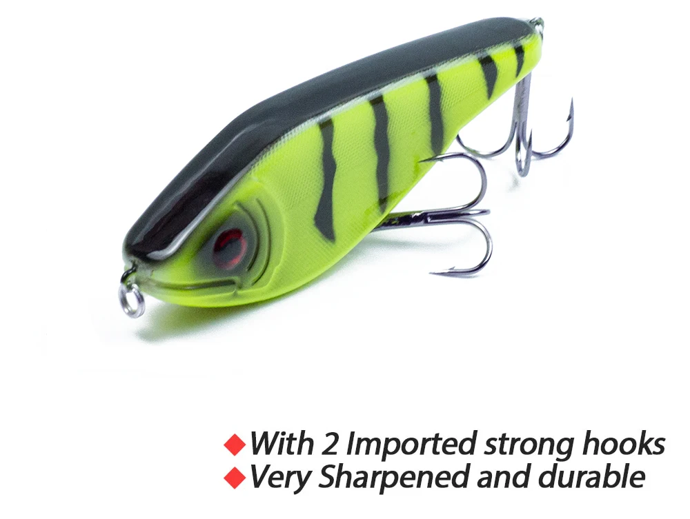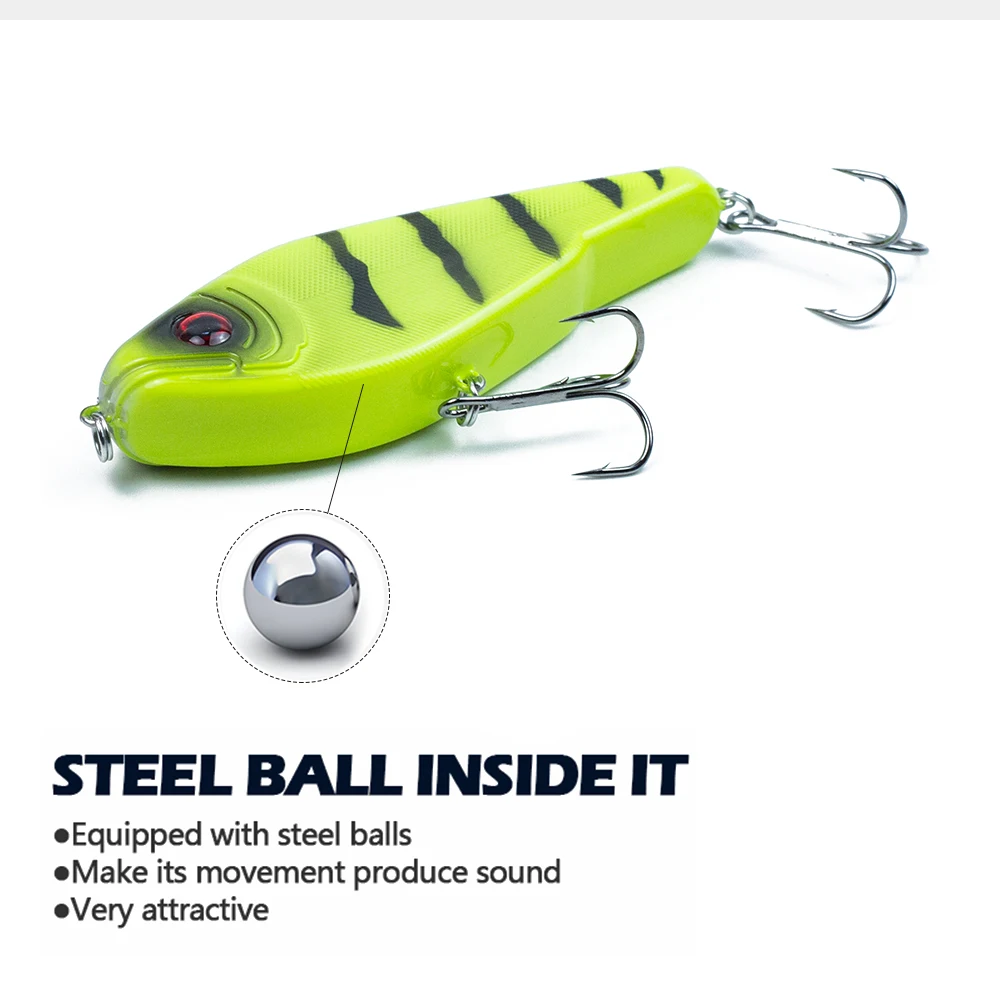 3) Estructura general: la estructura interna utiliza la bola de acero para equilibrar la conducción. Cuando Tomas la línea, la bola en el cuerpo se transmite a otras partes y produce sonido, lo que puede llevar al pez a perseguir. La forma está hecha de acero al carbono con 2 anzuelos triples súper afilados para garantizar que los peces no se escapen. Esos Jerkbaits son ideales para capturar especies marinas y de agua dulce.