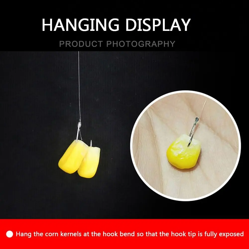 -How to use:This product can be used in combination with luring and fishing, open the bag and select the corn with full grain to be used as fishing bait, hook for fishing bait, the hook tip passes through the centre of the corn and allows it to be able to slide back and forth within the range of the build to the hook shank, exposing the tip of the hook to facilitate the hook tip, and facilitates the hook tip to puncture the fish after the corn is dislodged.