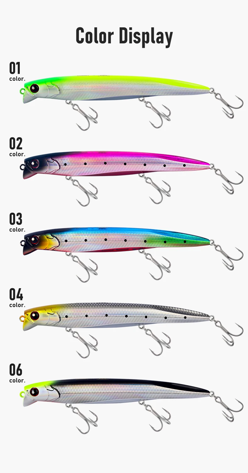 5. Disponible en 01-06 colores, adecuados para diversas aguas, condiciones de luz y condiciones de pesca, ¡lo que garantiza una alta atracción del señuelo para todo clima!