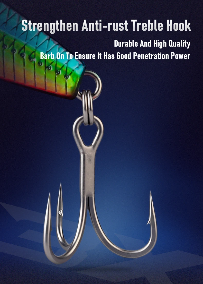 3.El señuelo ABS de alta resistencia con revestimiento resistente a rayones resiste impactos y mordeduras, manteniendo su forma incluso después de impactos repetidos.El anzuelo triple reforzado y resistente al óxido ofrece un rápido acoplamiento, mientras que el diseño de púas garantiza que pueda contener incluso los peces más grandes sin soltarlos.