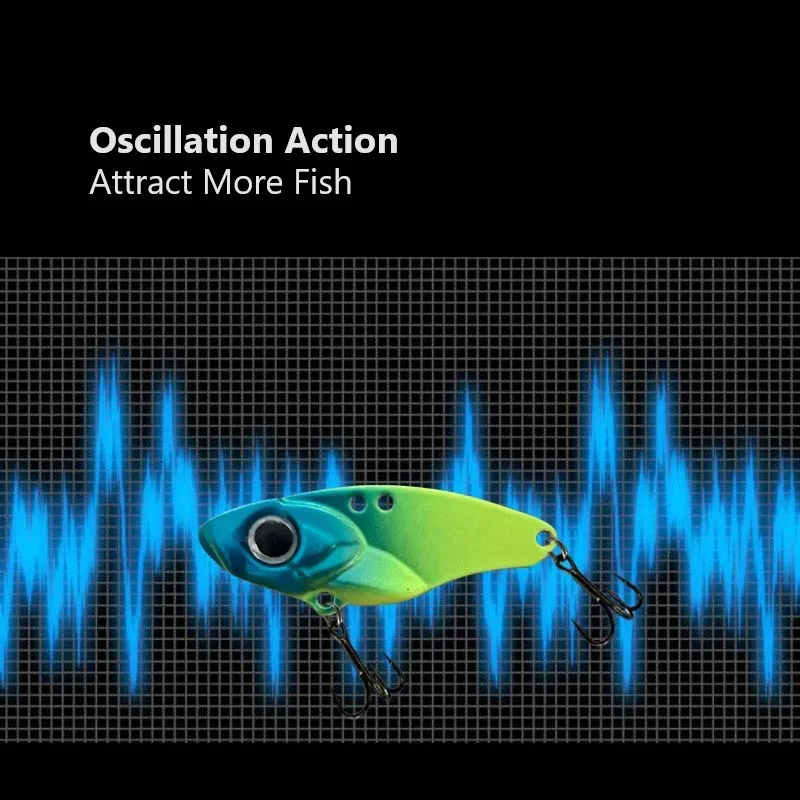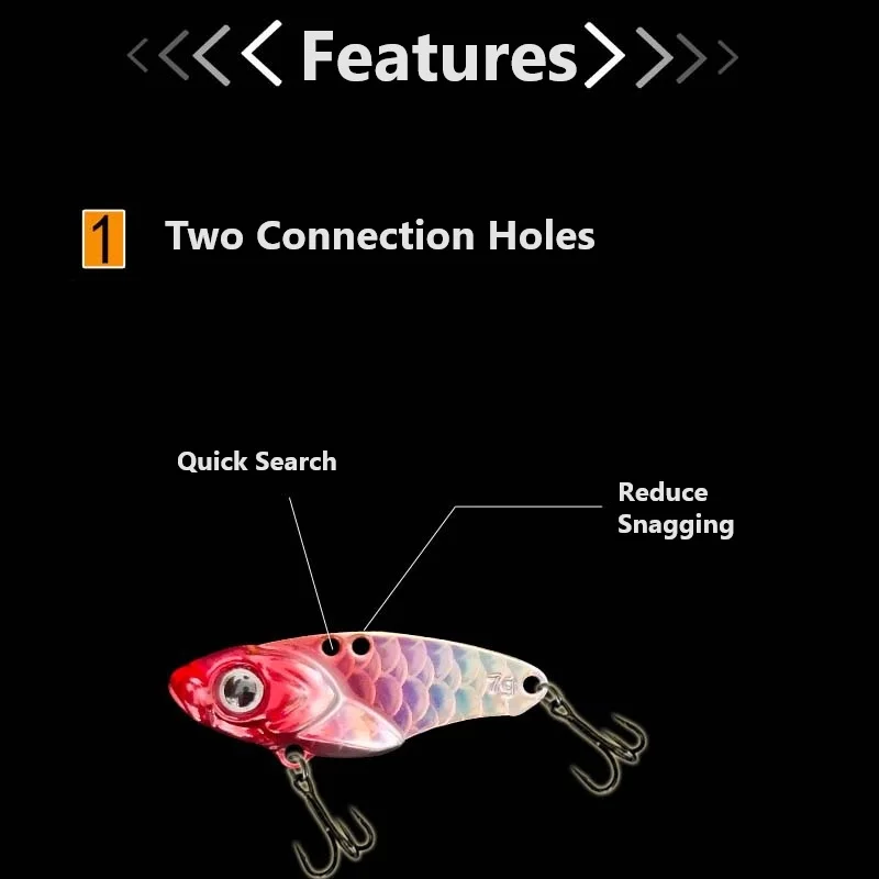 2. Nuestro cebo de cuchilla está hecho de material totalmente metálico, que es resistente a la corrosión y duradero. Los cebos de hoja vibratoria de color iridiscente pueden reflejar la luz como las escamas de un pez cebo real.