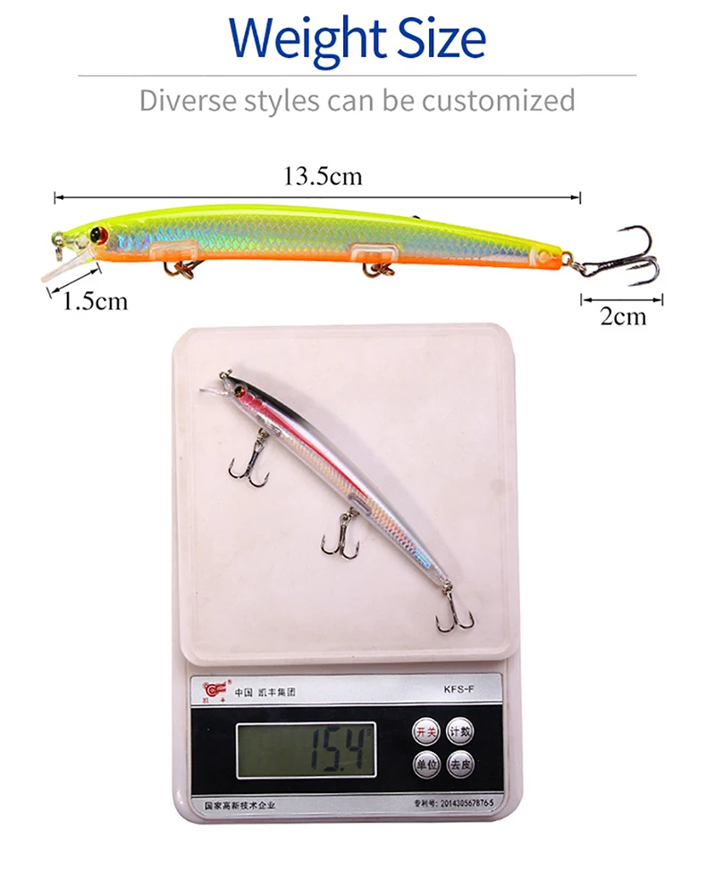 Señuelo de pesca Minnow de 135mm, 14,5g, láser, buceo, 0,5-1m, perca de pesca en el mar, cebo duro Artificial, señuelo para Lucio, anzuelo triple, aparejos Wobbler