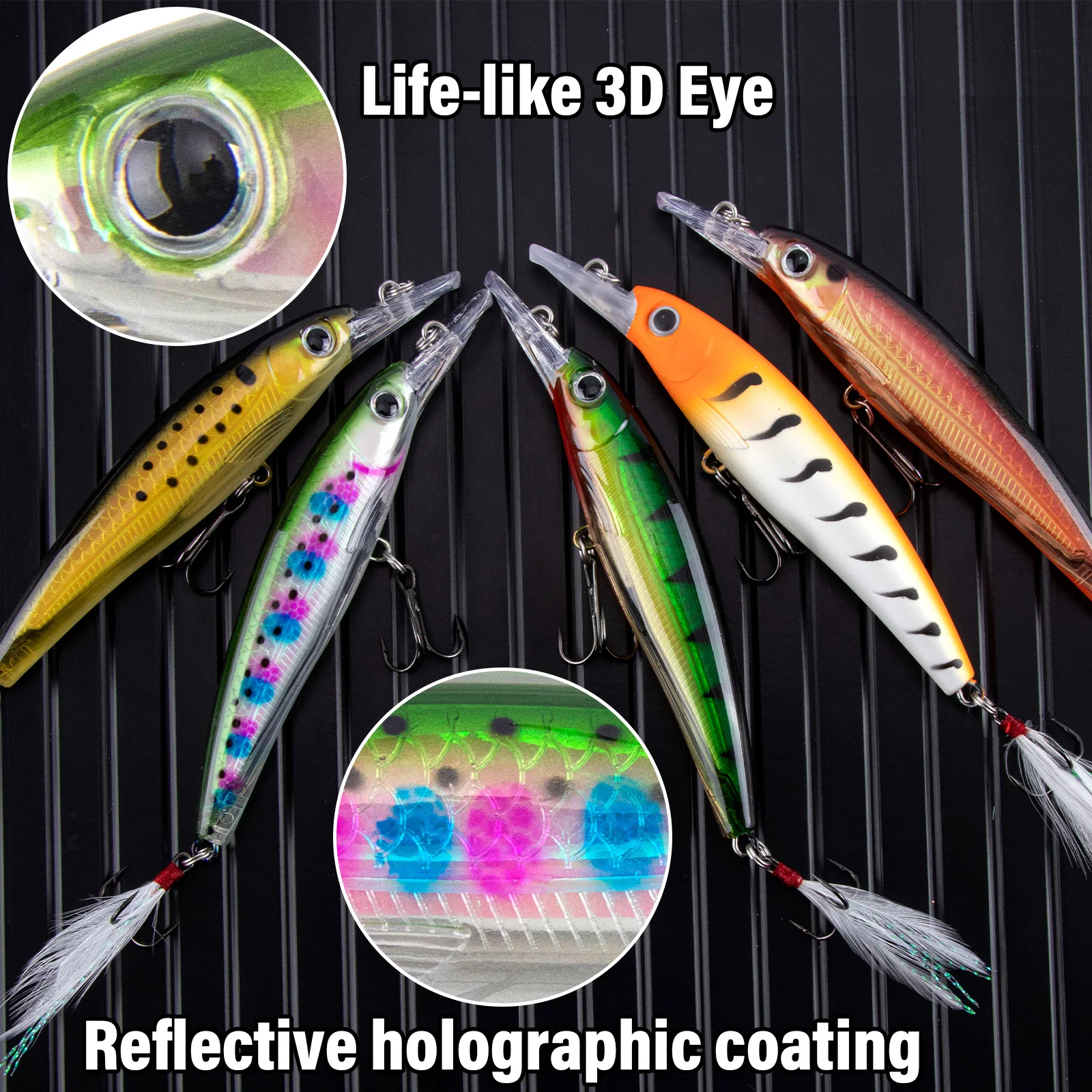 Este señuelo de pesca jerkbait cuenta con ojos 3D realistas, placas branquias de peces y revestimiento reflectante para reflejar la luz bajo el agua y atraer la atención de los peces, imitando las formas y colores de los peces reales para mejorar significativamente las posibilidades de un bocado.
