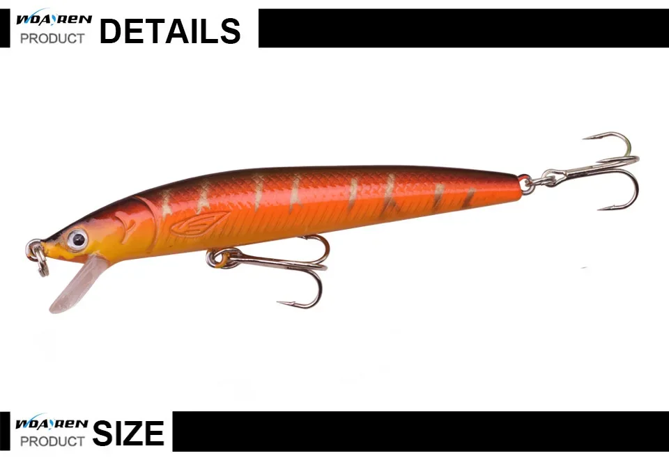 Marca: WDAIREN Longitud: 9,5 cm/3,74 pulgadas Peso: 7,5 g/0,28 oz Profundidad de natación: Topwater is_customized: Sí Tipo: señuelo de pesca minnow Material: ABS Ganchos de calidad: 8# Anzuelos triples fuertes Anillo: anillo plano fuerte Peixe objetivo: chub pálido, lubina, picos, carpa de control amarillo, perca china, culter de boca superior Color: 10 colores diferentes