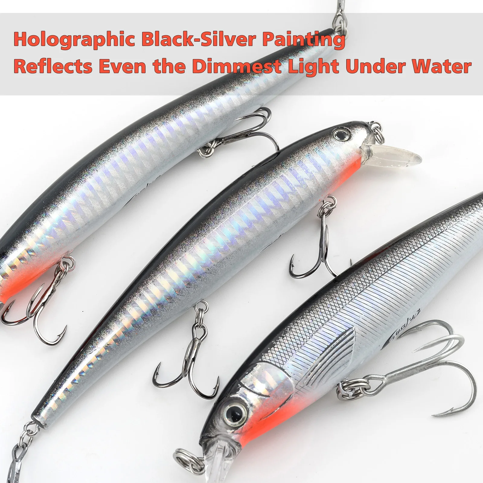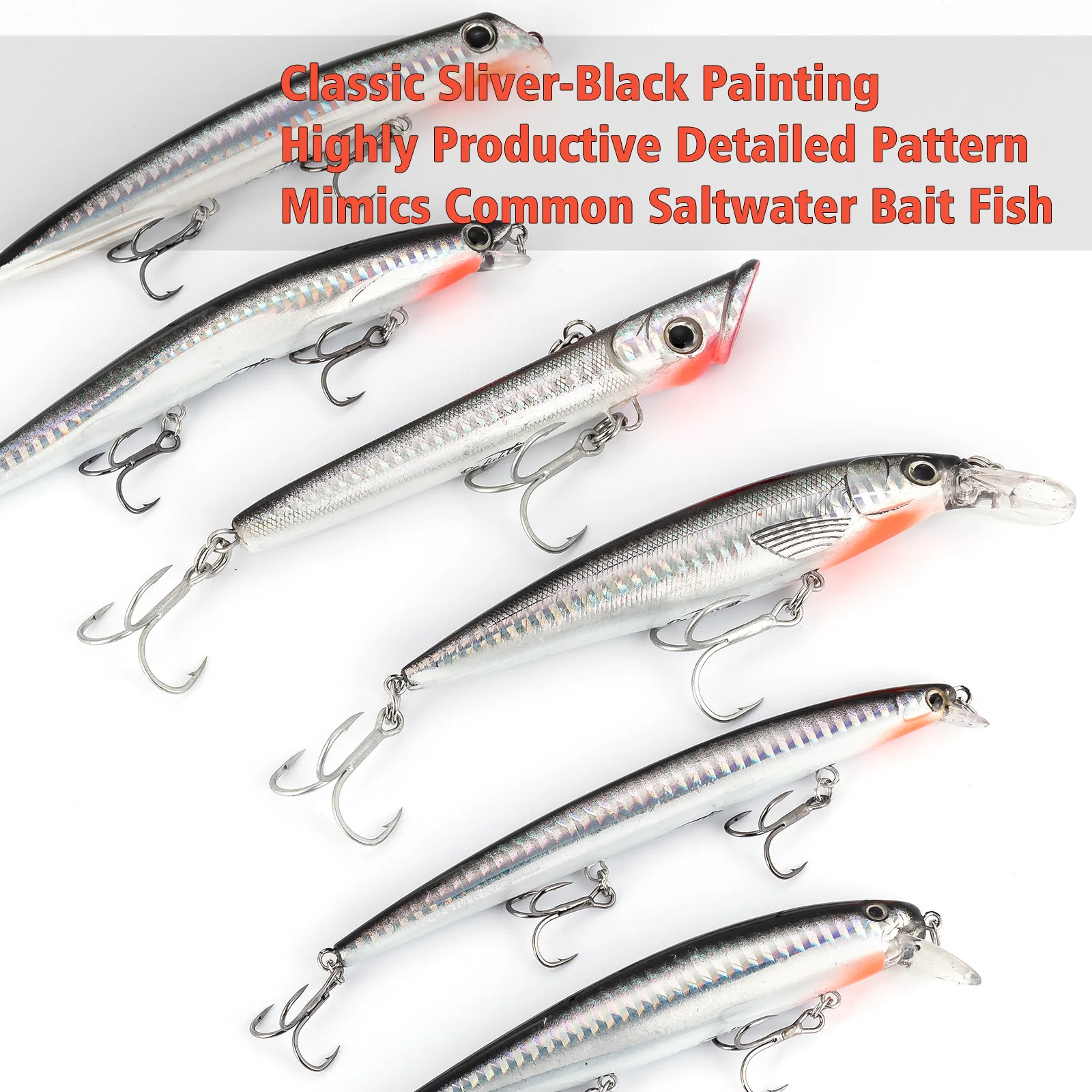 Última modificación: 2 de ellos equipados con anzuelos triples Mustad, 2 con anzuelos triples de acero inoxidable de agua salada ultra fuertes y los otros dos con anzuelos triples afilados. Sistema de cámara superior Rattler, acción de natación realista en el agua.