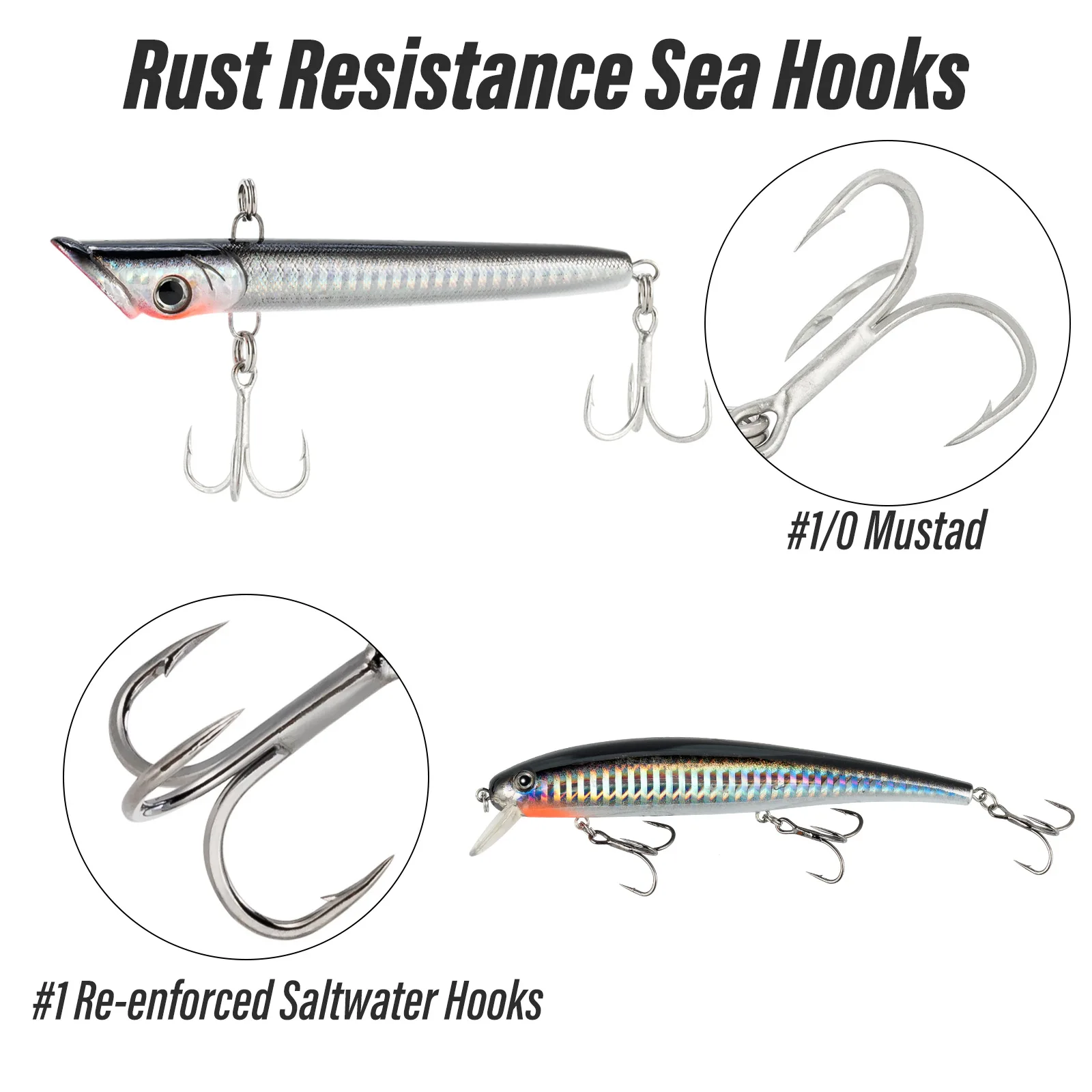 Todos los materiales de los componentes se seleccionan estrictamente. Equipado con ganchos afilados triples chapados NSB fuertes. Mucho mejor calidad que los kits con un precio final de menos de 1 dólar por pieza.