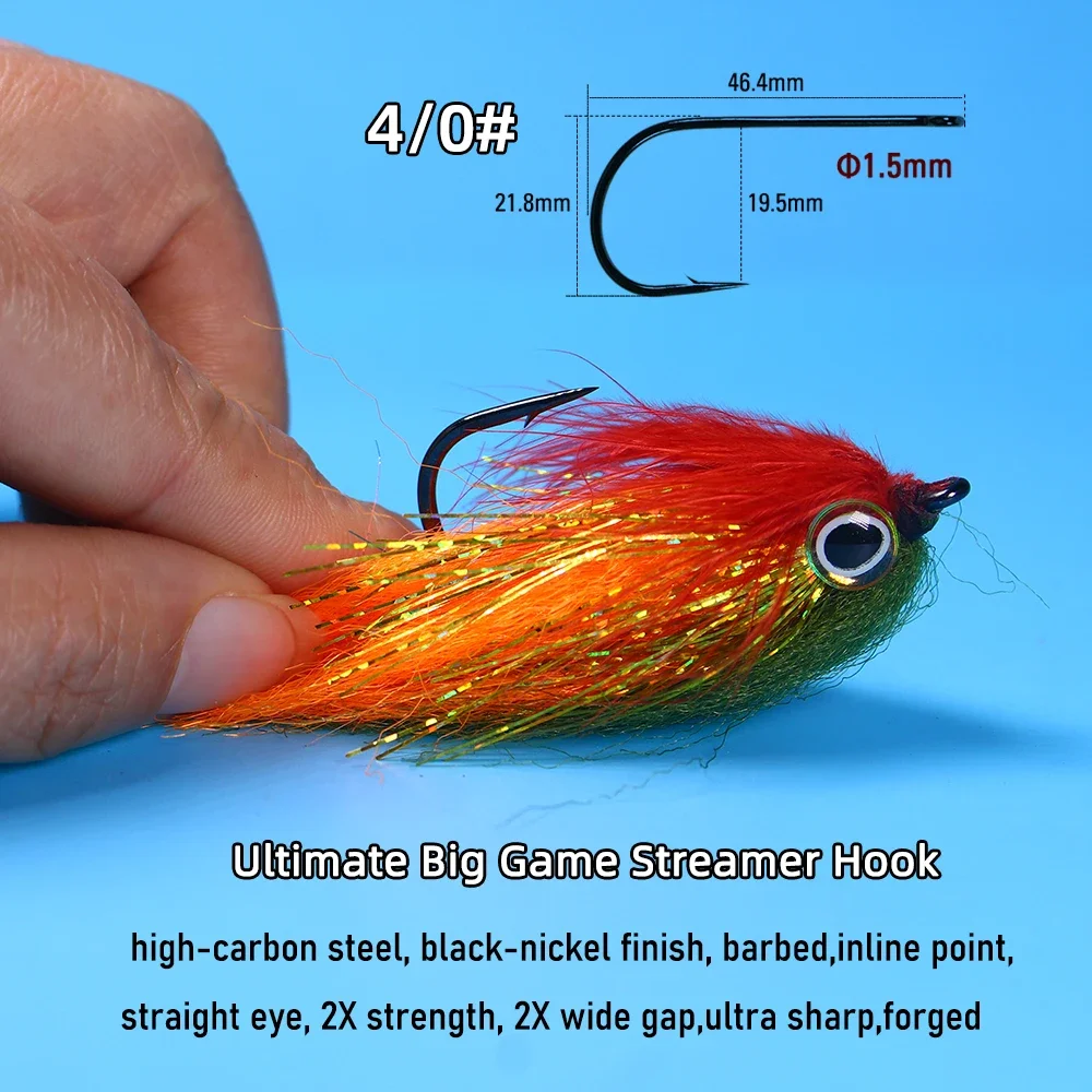El nuevo desarrollo Big Streamer Fly presenta un par de ojos realistas en 3D y una buena combinación de mosca flash streamer, hackle marrón griziano y 2 plumas de hackle de sillín de colores sólidos brillantes: una excelente apariencia para imitar peces cebo, minnow y haya.Las moscas están atadas por tyers experimentados. Esta es una de las moscas más populares para capturar truchas, lucios, tiras, steelhead, tarpon y otras especies de agua salada, etc.Disponible en tallas 2/0 y 4 colores.