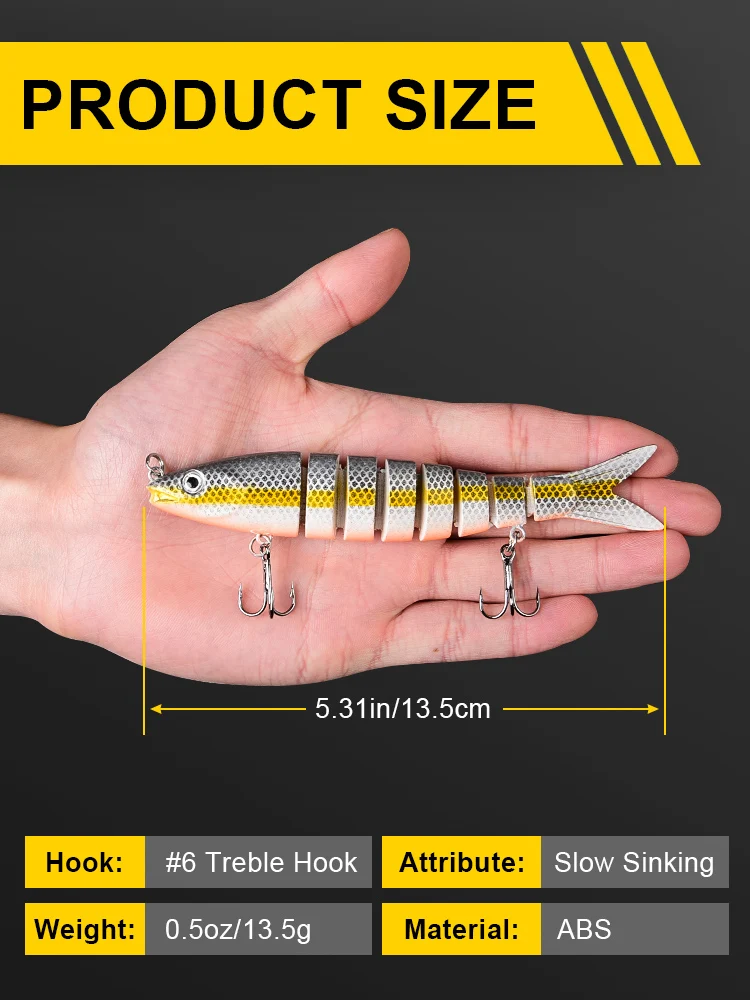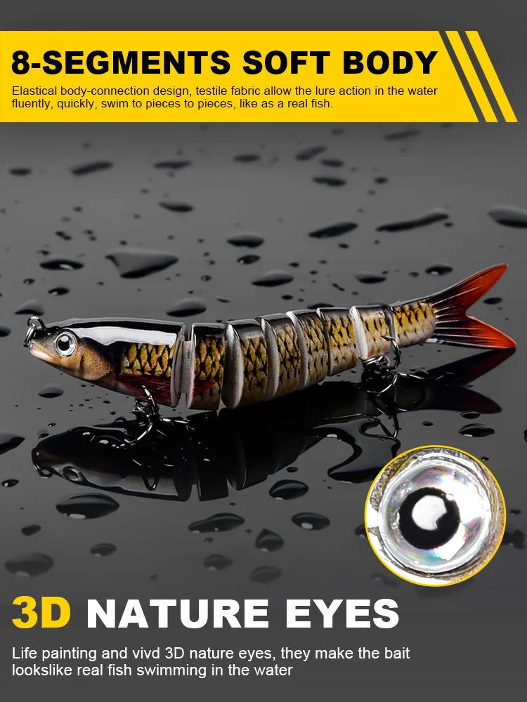 • Señuelos realistas de 8 segmentos: diseñados con 8 secciones de cuerpo segmentado, los Señuelos de Pesca pueden hundirse lentamente y ofrecer una acción de natación natural en forma de S a cualquier velocidad, lo que provocará picaduras más rápidas.