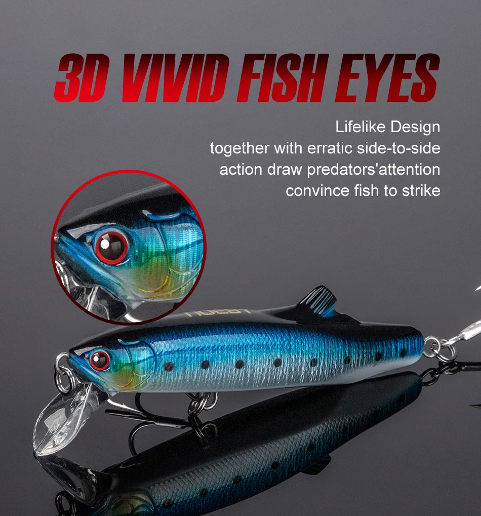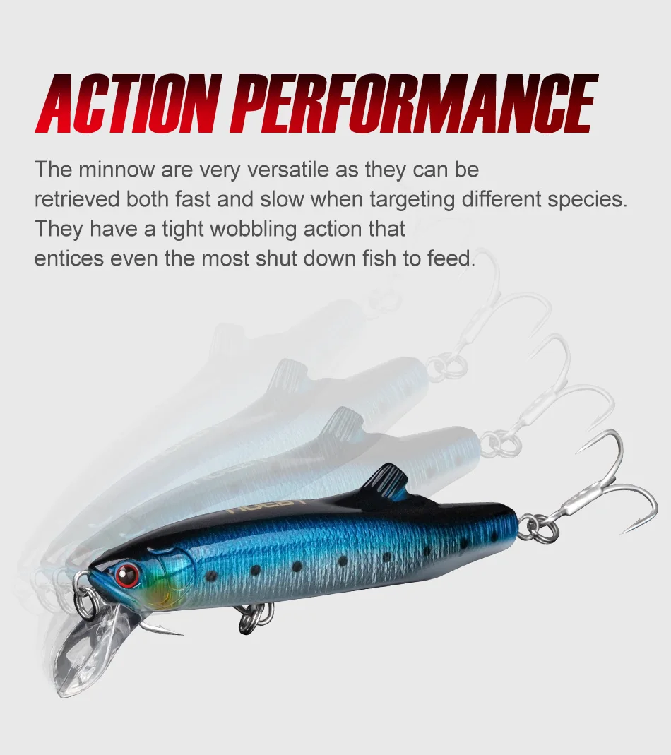 Los pececillos son muy versátiles ya que se pueden recuperar tanto de forma rápida como lenta al apuntar a diferentes especies.Tienen una acción de tambaleo apretada que atrae incluso los peces más apagados para alimentarlos.
