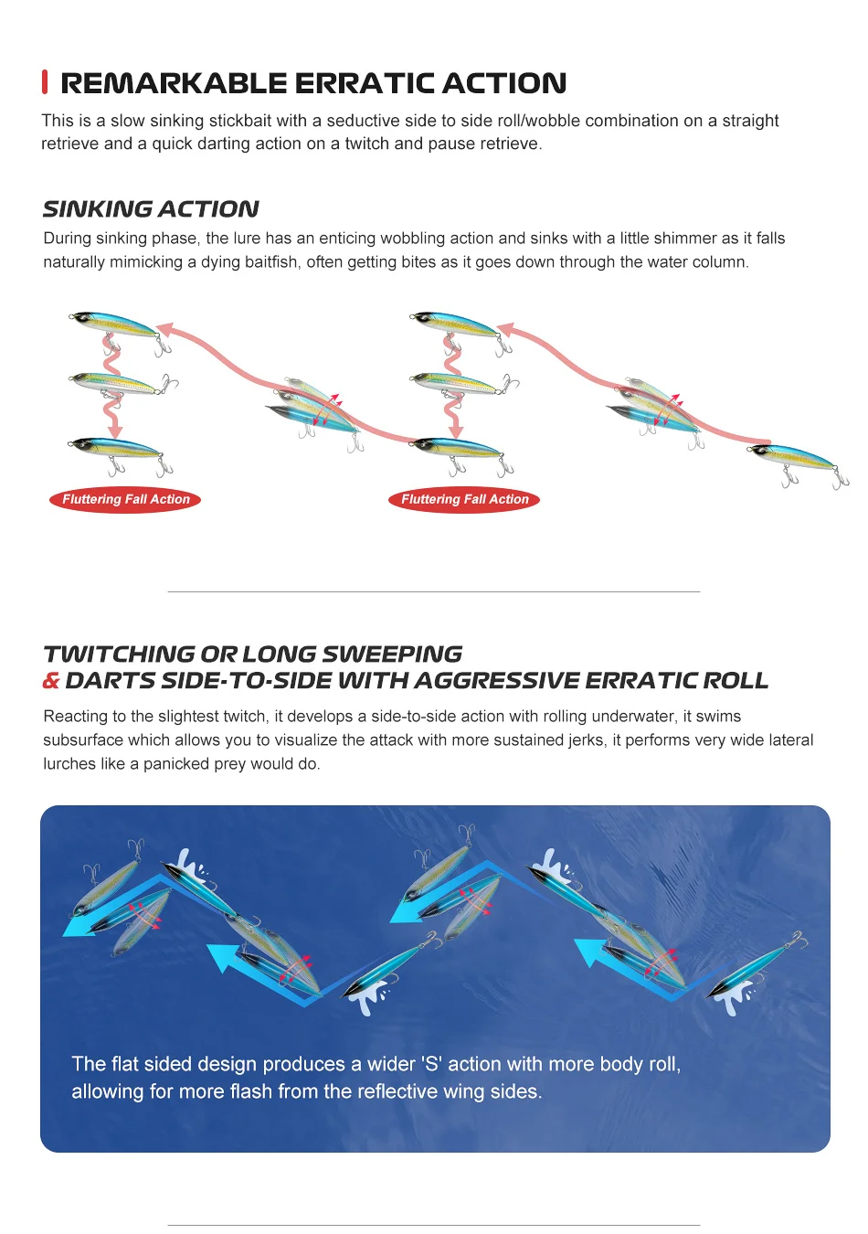 This is a slow sinking stickbait with a seductive side to side roll/wobble combination on a straight retrieve and a quick darting action on a twitch and pause retrieve.
