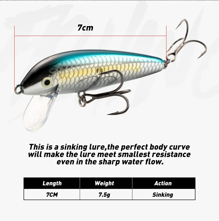 JOHNCOO 70S señuelo de pesca Minnow hundido 7cm 7.5g trucha Artificial Ajing Stream Lake Jerkbait Rockfishing cebos duros