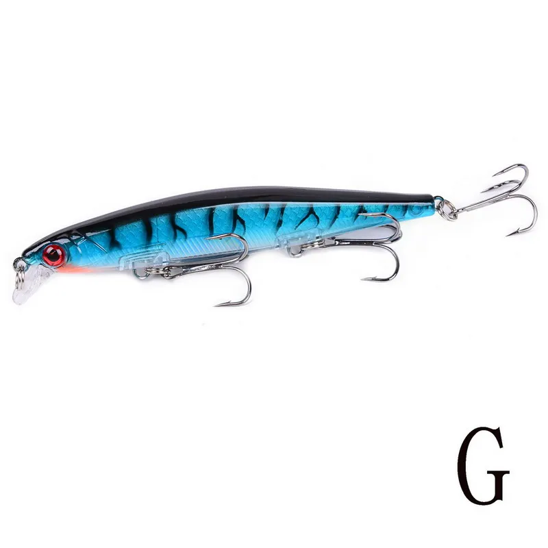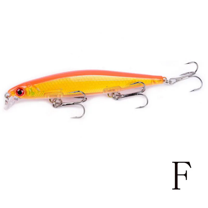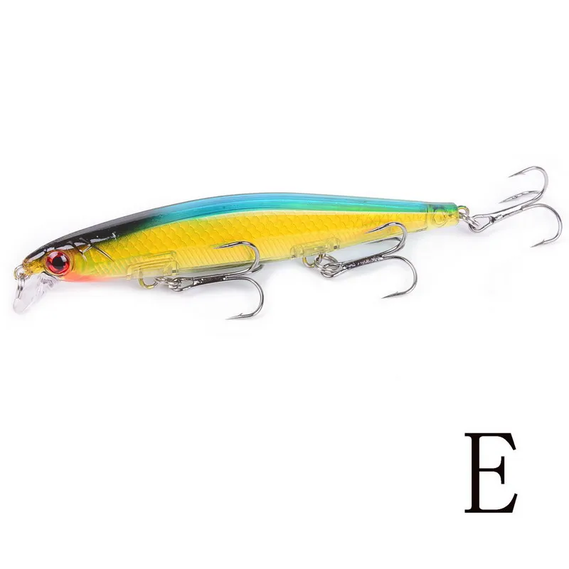 Características:1. El cuerpo del cebo adopta materiales avanzados de protección del medio ambiente, no solo tiene una alta resistencia al impacto, sino que también no produce sustancias nocivas para el medio ambiente.2. El cebo está diseñado para tener el mejor equilibrio para que el cebo pueda nadar a la velocidad de recuperación más lenta posible.3. Los cebos tienen una pintura realista y ojos 3D vívidos, hacen que el cebo parezca un pez real nadando en el agua durante la pesca.4. Cuerpo colorido: Diseño de simulación, más atractivo para los pecesEspecificaciones:Tipo de señuelo: señuelo de pesca de pececilloLongitud: 110mm/4,33 pulgadasPeso:12,9g/0,44 ozCollar de onzasProfundidad de buceo: 0,2 m-1mOjos: ojos 3DGancho: Ganchos afilados de alta calidadAnillo: Anillo dividido planoColor: 8 coloresPez Blanco: Lubina, Lucio, pez negro amarillo, pez superior C.