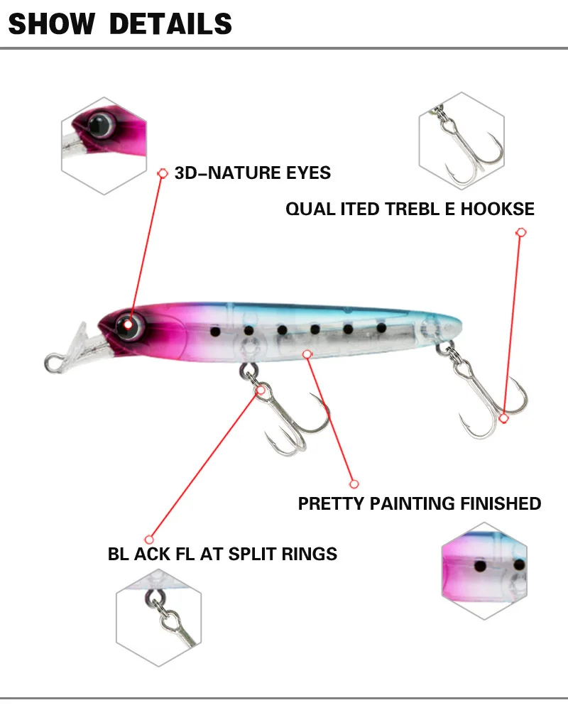 3. Los cebos tienen pintura realista y ojos 3D vívidos, hacen que el cebo parezca un pez real nadando en el agua durante la pesca.