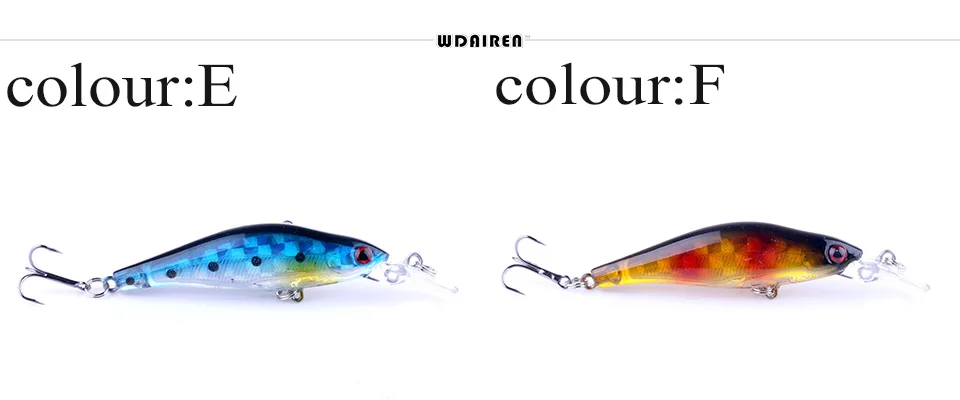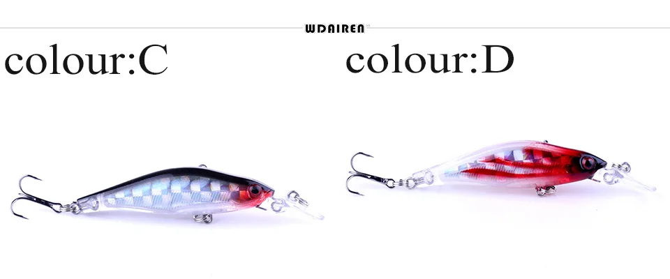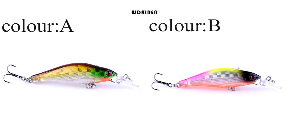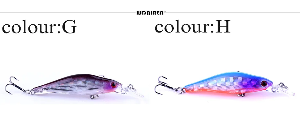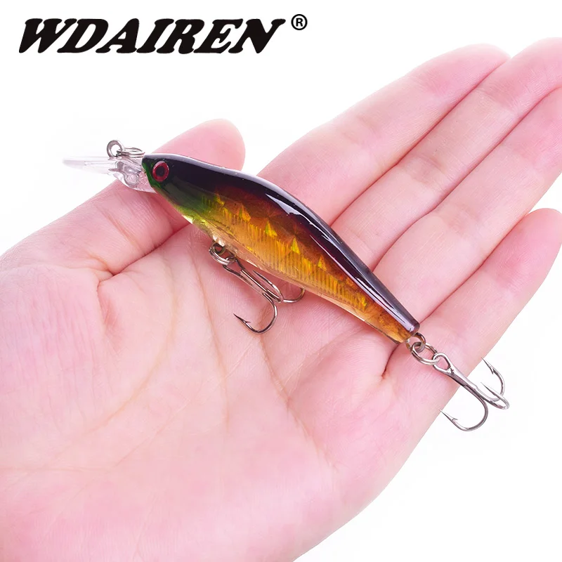 1 piezas de señuelo de pesca de pececillo láser de 80mm 6,5g que se hunde lentamente señuelos de lubina cebo duro Artificial carpa Crankbait aparejo de pescaMarca: WDAIRENTipo: señuelos de pececilloPeso: 6,2gLongitud: 80mmColores: 8 colores diferentesTipo de anzuelo: anzuelo triple de acero al carbono n. ° 6Profundidad de buceo: 0,2-1,2 MMaterial: plástico láser ABSLista de embalaje:1 * Señuelos de Pesca