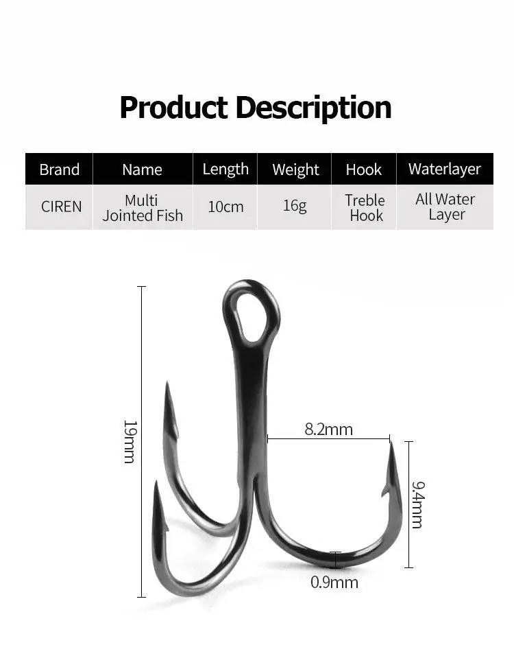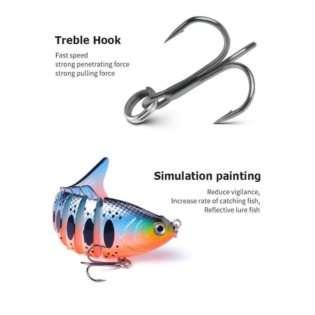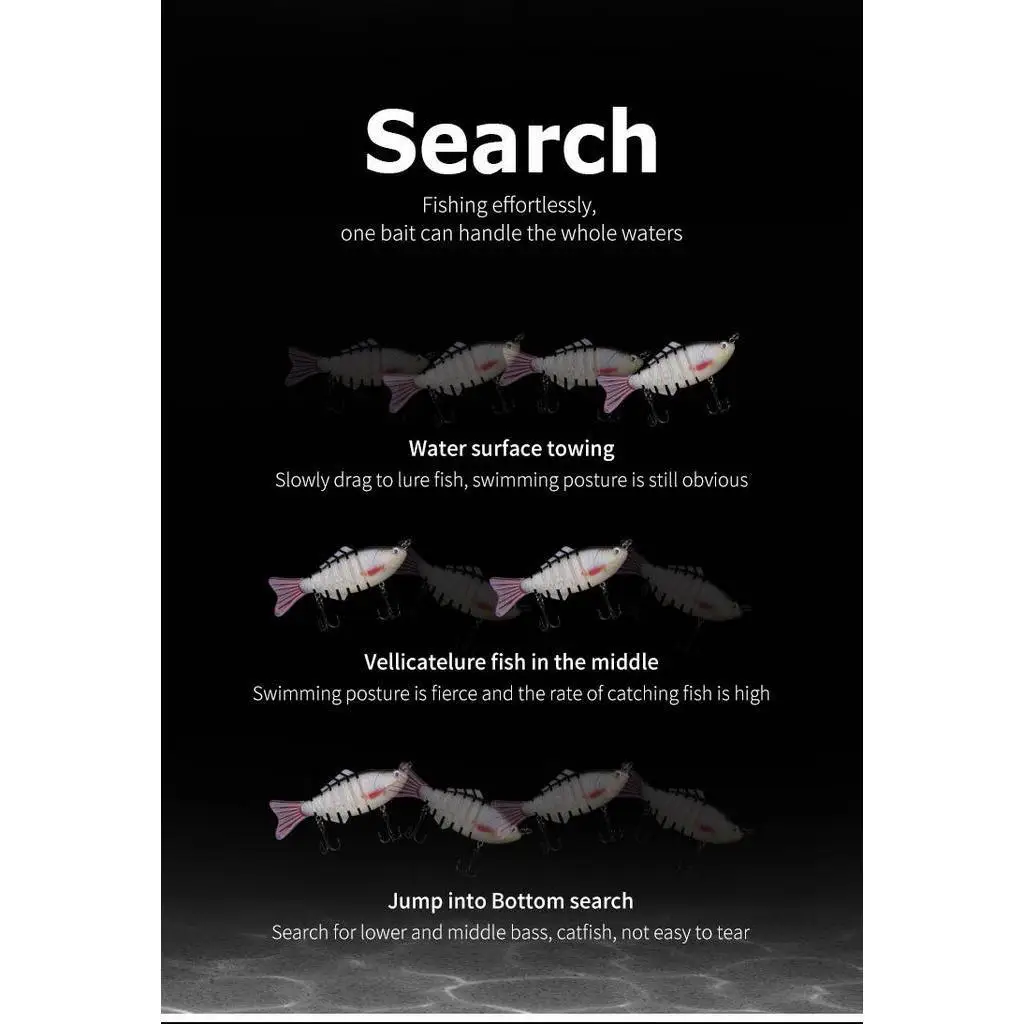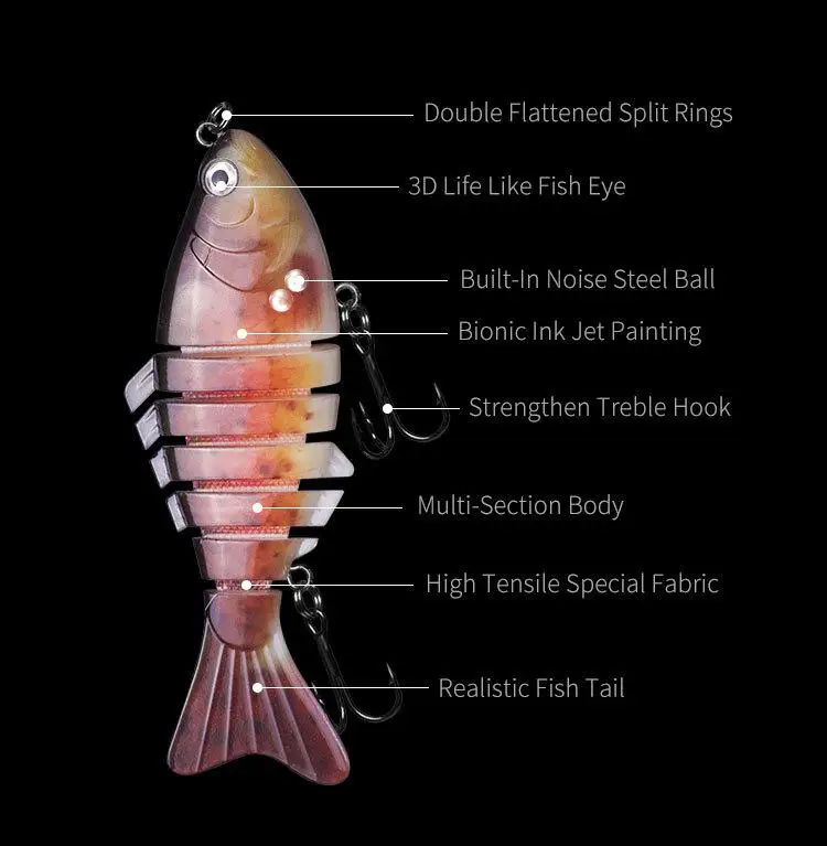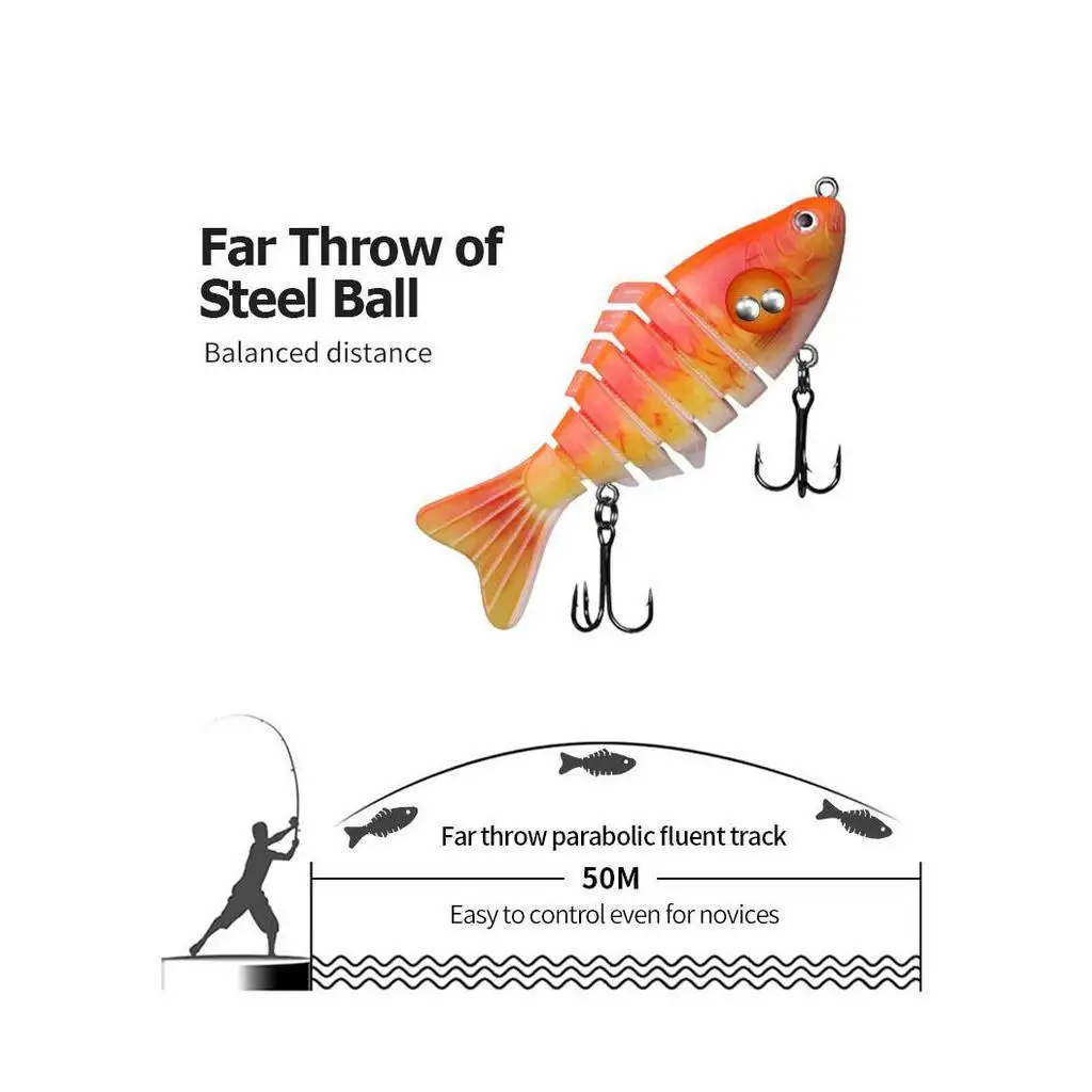 (2) El cuerpo y la cola flexibles del pez están unidos con 7 secciones, lo que permite a los pescadores recuperar la acción de natación natural en forma de S, como si el pez real se mueve en el agua.Con su bola de gravedad incorporada, los pescadores pueden lanzar los cebos de pesca a larga distancia y luego ajustar fácilmente el centro de gravedad para recuperarlos.