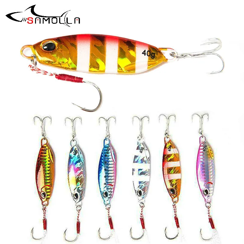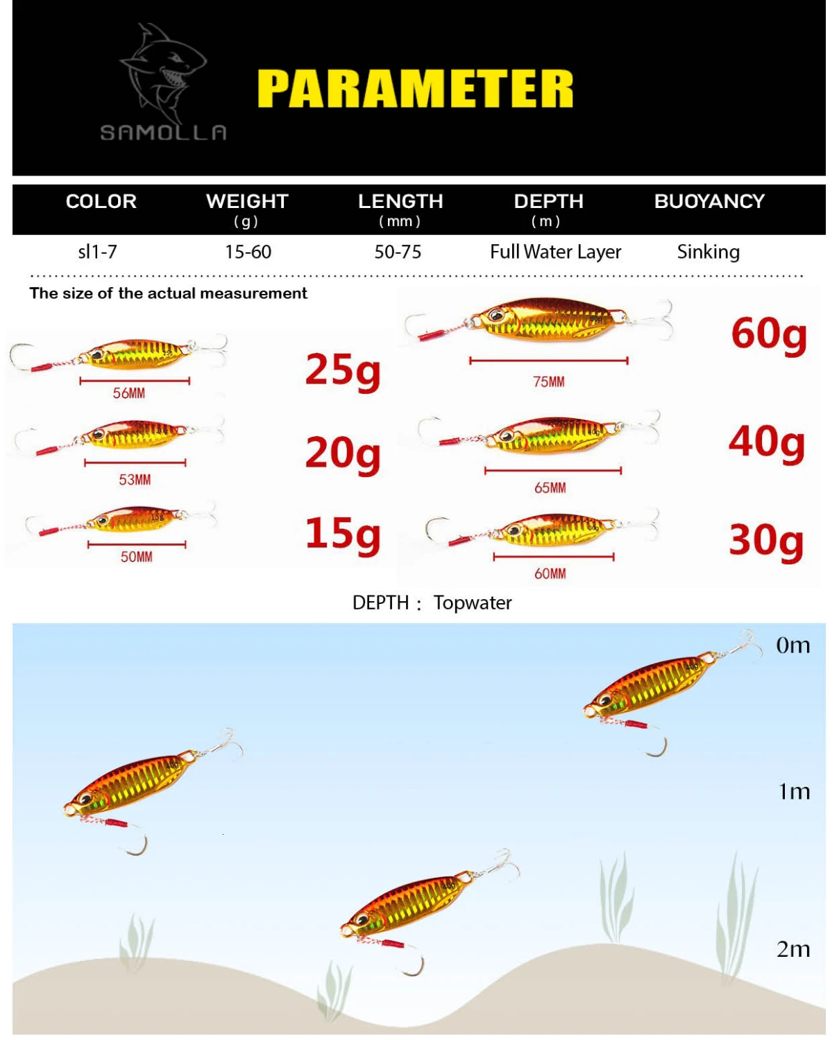 Detalles del producto: Marca: SAMOLLA Modelo de señuelo: JIG Tipo de señuelo: señuelo de pesca duro Peso del señuelo: 15-60g Longitud del señuelo: 35-75mm Profundidad de buceo: Flotabilidad: hundimiento Ganchos: Equipado con ganchos anticorrosión de Ojos: ojos de pez 3D Anillos: bicíclicos individuales Colores: 7 colores