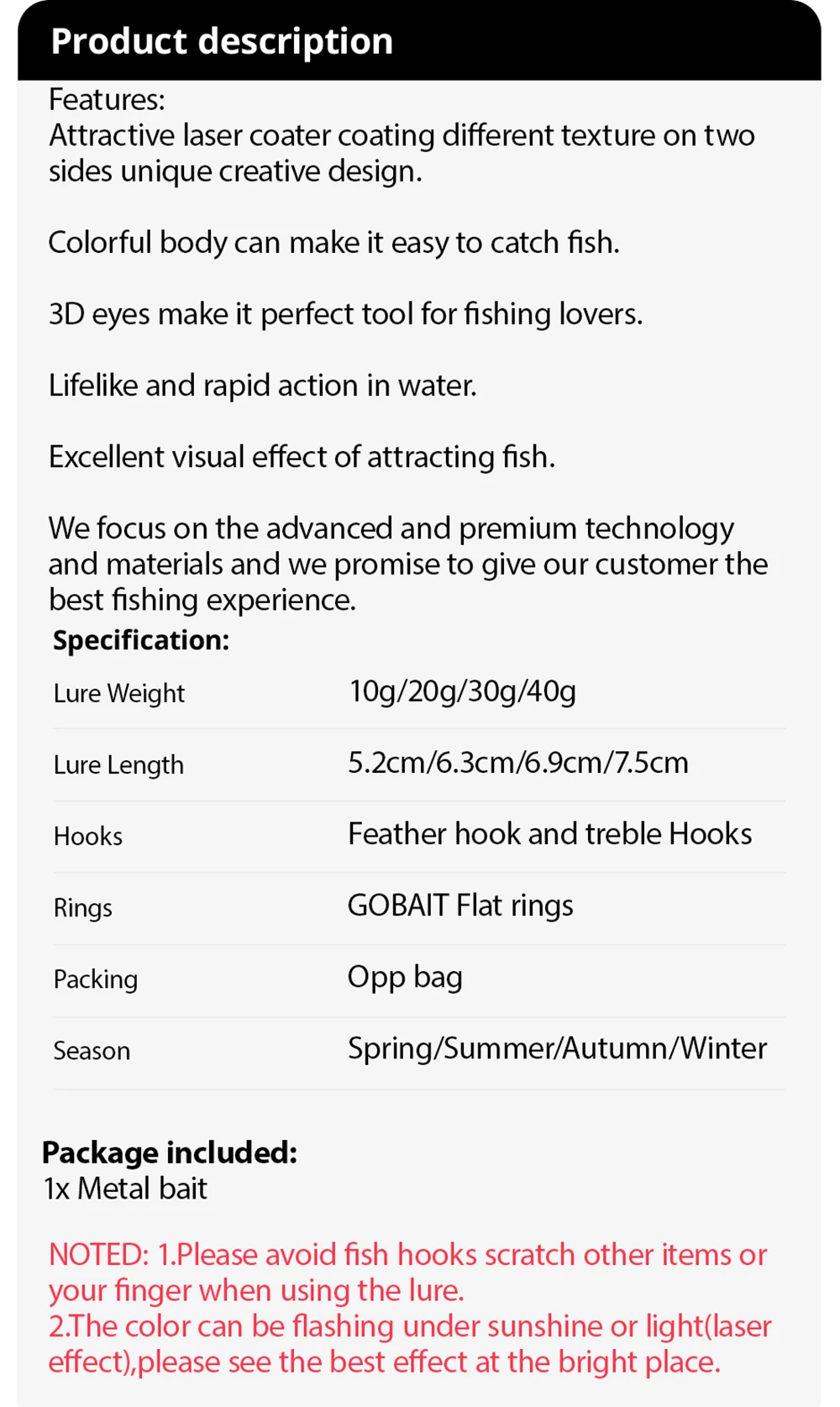 1. revestimiento láser atractivo revestimiento de textura diferente en dos lados diseño creativo único. El diseño de simulación de la piel de pescado mejora su capacidad para atraer peces grandes. Cuerpo colorido puede hacer que sea fácil de atrapar peces.