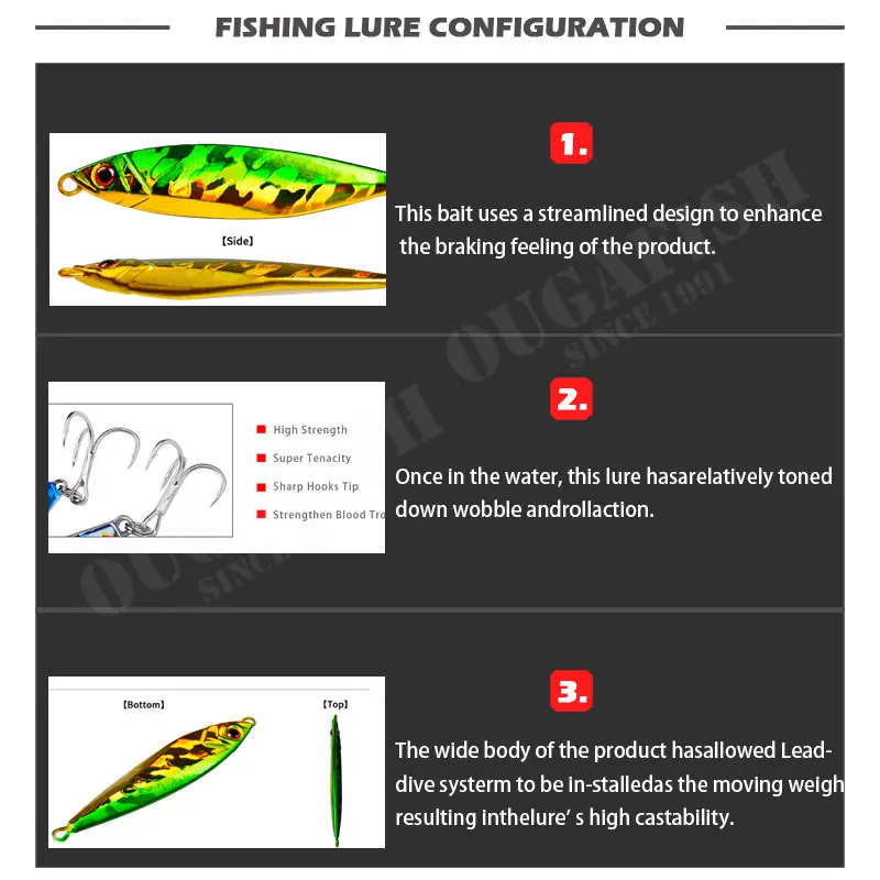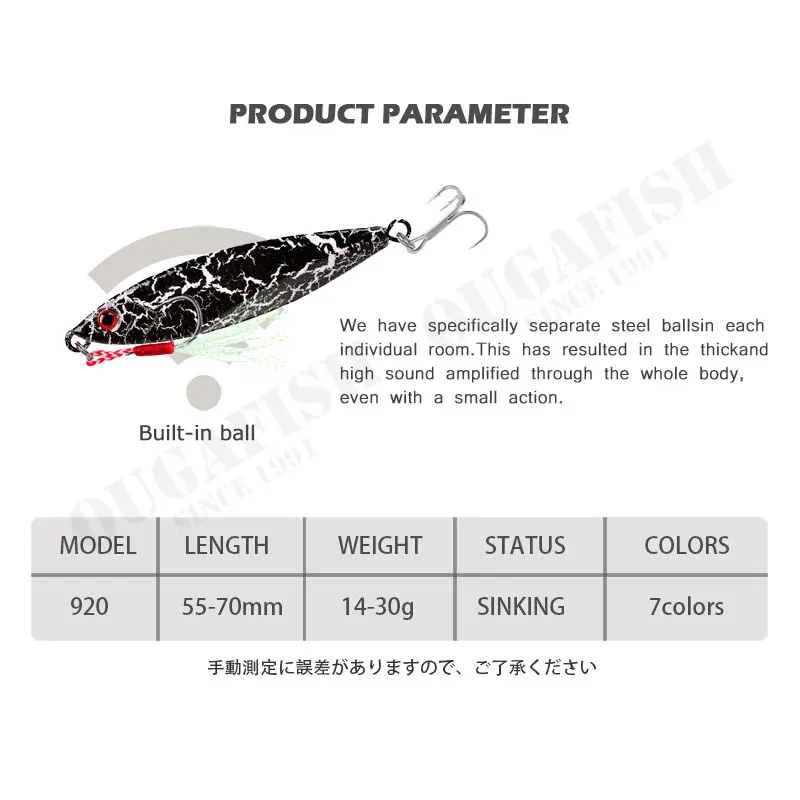 6. Bolas de metal: Bolas de acero inoxidable en el interior, para mantener el equilibrio del señuelo de pesca, para la mayor distancia de lanzamiento.