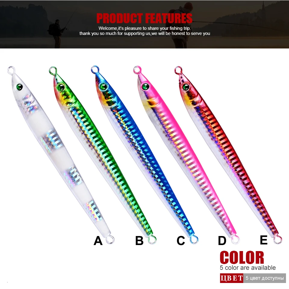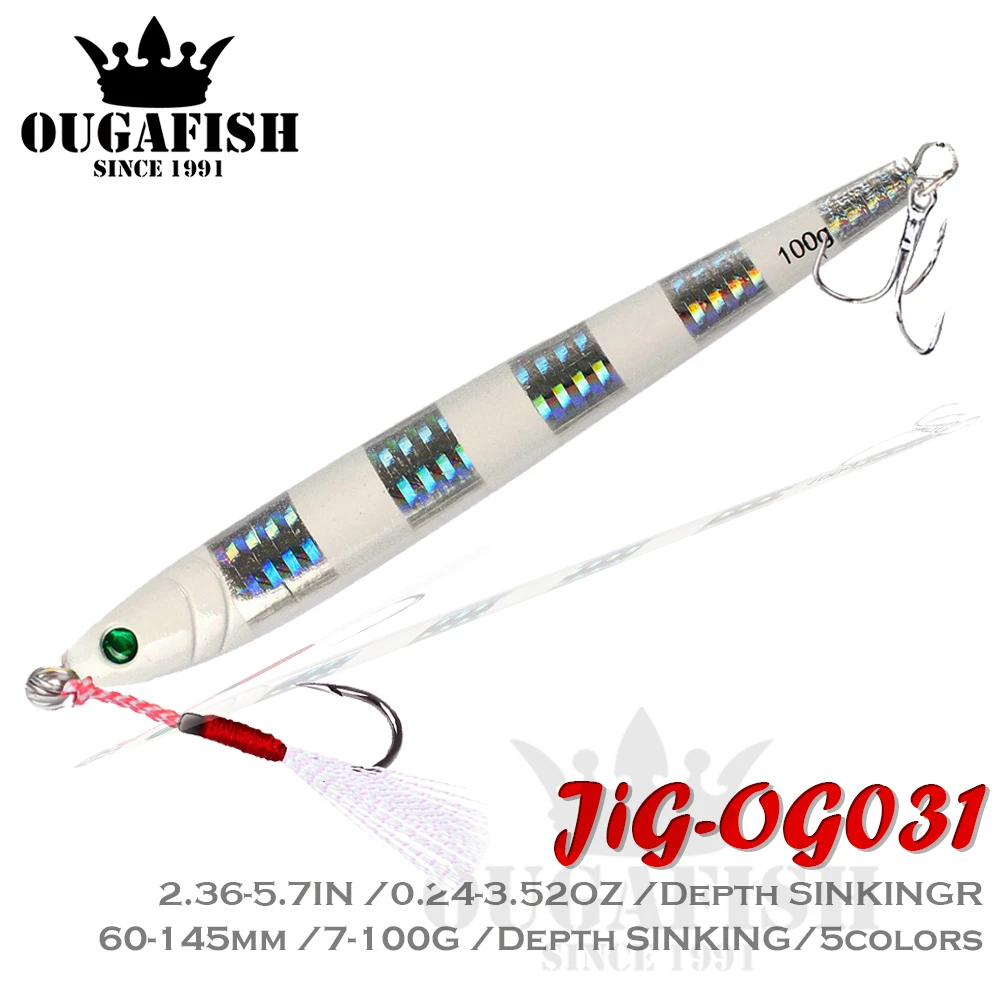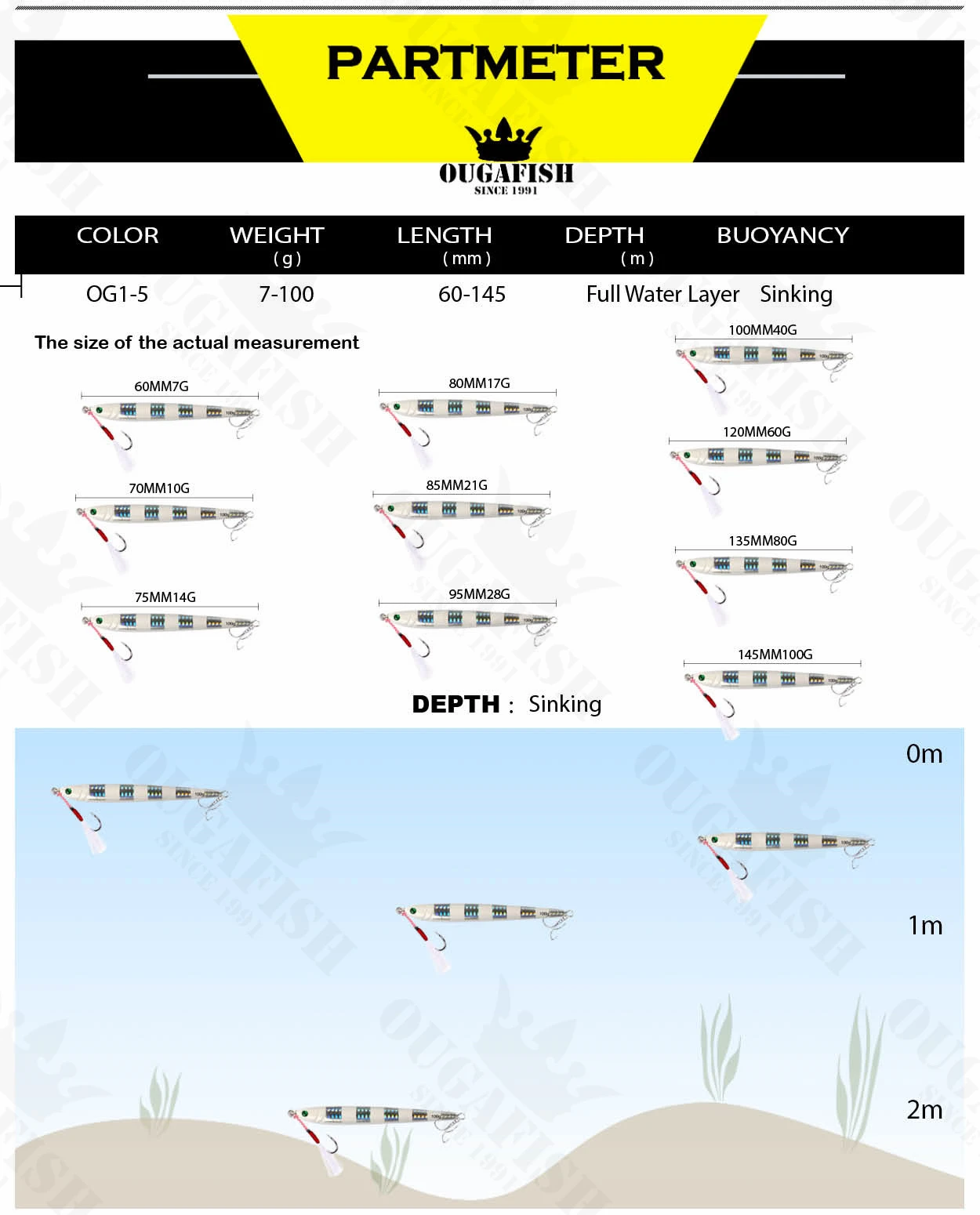 Detalles del producto: Marca: OUGAFISH Modelo de señuelo: Jig Tipo de señuelo: señuelo de pesca duro Peso del señuelo: 21-100g Longitud del señuelo: 85-145mm Profundidad de buceo: Flotabilidad: Ganchos de hundimiento: equipado con piezas Anzuelos anticorrosión: Anillos de Ojos de pez 3D: Colores individuales bicíclicos: 5 colores