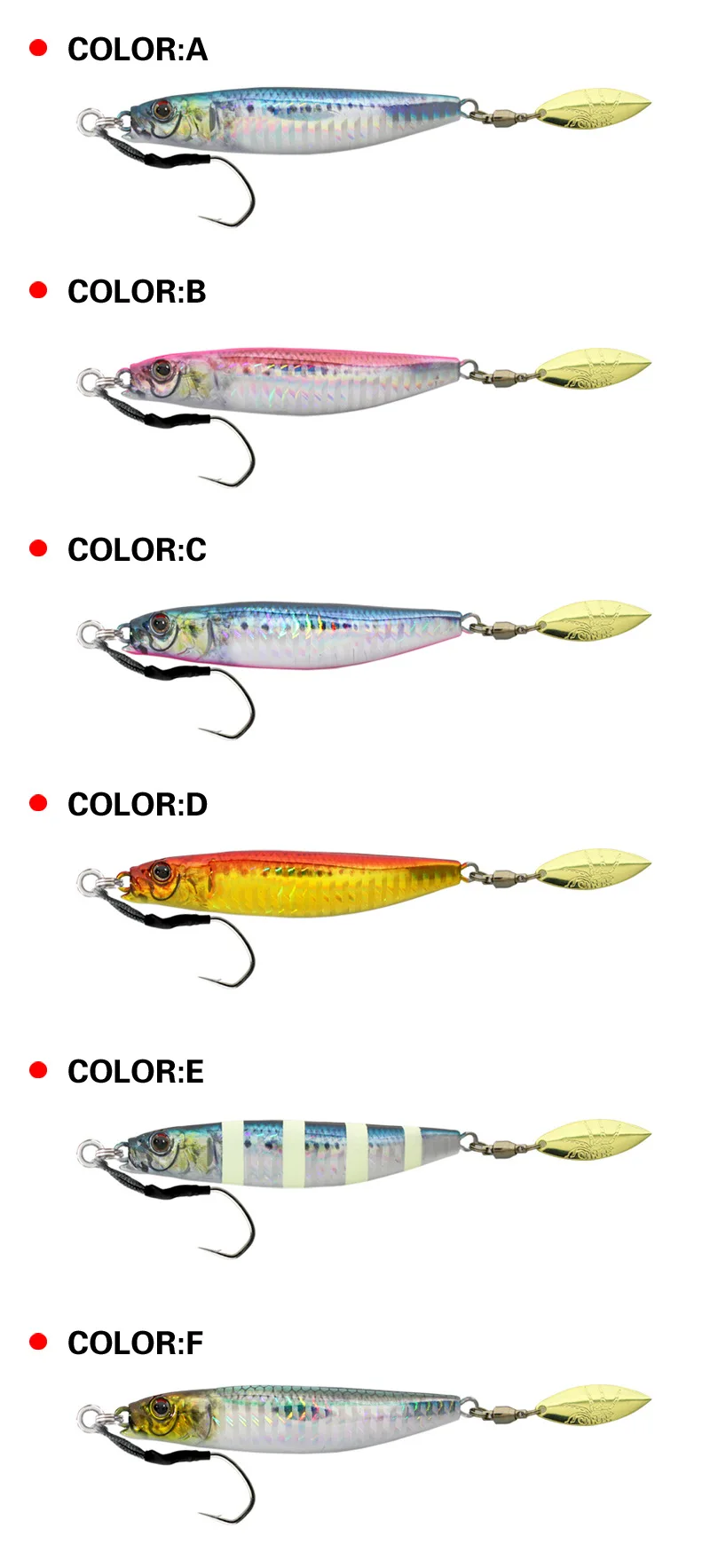 Marca: VIB atraerTipo: cebo VIB giratorio de metalLongitud: 75mmPeso: 40gProfundidad: hundimientoMaterial: aleación/acero inoxidable personalizado: SíColor: 6 colores diferentesContenido del paquete: 1 señuelo de pesca