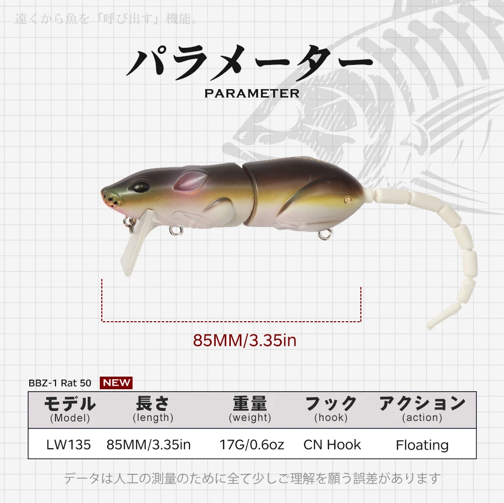 Señuelo de pesca artificial, señuelo de ratón de plástico, cebo de pesca de rata, señuelo de pesca con anzuelo, aparejos de pesca, crankbaits minnowDetalles Tipo: Cebo de pesca artificialForma: RataColor: negro/blanco/gris/marrón (opcional)Material: cuerpo de plástico ABS y gancho de acero de carbono, afilado, firme y duradero.Tamaño: 8x2,3 cm/3,14x0,9 pulgadasNúmero de sección: 2Posición: Lago, Océano playa pesca, Océano barco pesca, Océano roca pesca, río, arroyoCaracterística 1. ¡Excelente señuelo para Lucio, lubina, almizclado y bagre grande y brutal!2. Esta imitación de rata en 3D es tan radical, solo tuvimos que llamarla "Rad", está cargada de características innovadoras3. Los detalles escaneados en 3D engañarán incluso al pez depredador más variado y le asegurarán ataques brutales. Cuerpo ABS duro ultra fuerte.4. Como una rata nadando con una gran acción de curva S rodante y subsuperficie.