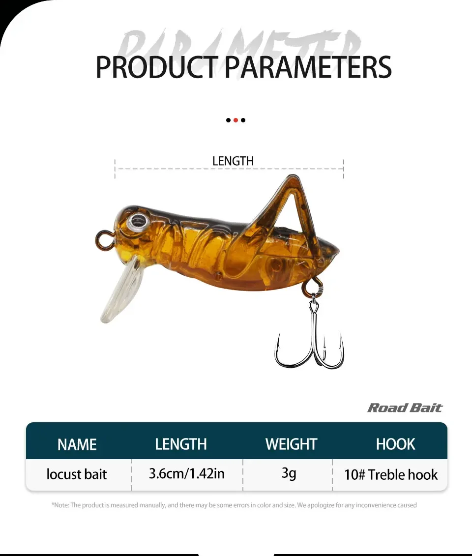 Nombre del producto Señuelos de pesca insectos saltamontes Peso 46g/caja Longitud 3,6 cm/1,42 pulgadas Gancho Gancho triple