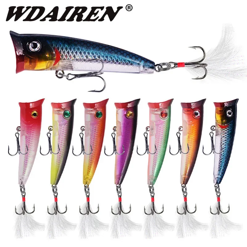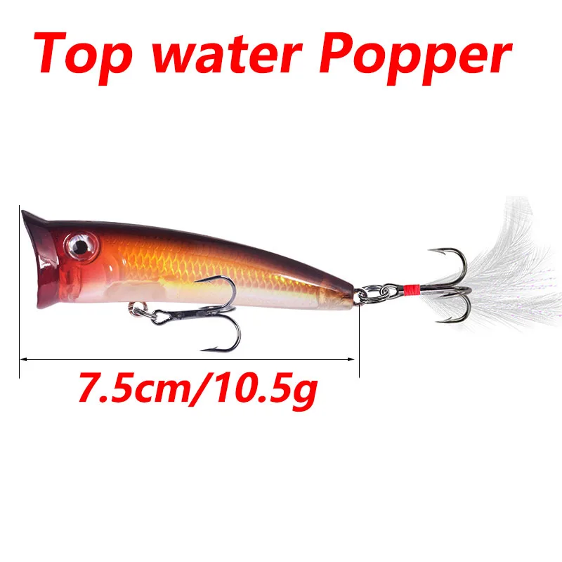 Señuelos de Pesca Popper de 1, 7,5 cm, 10,5g, Wobblers Topwater con anzuelos de plumas, cebo Artificial de plástico láser, aparejos de pesca de lubina