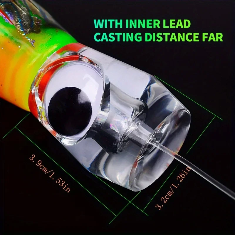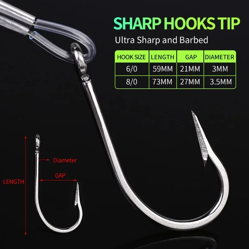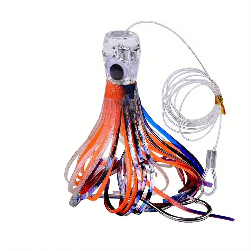 Quantity: 1 Piece Weight: 70G, 96G Length: 6inch, 9inch Material:Rubber skirts lure, Stainless steel fishing hooks, Nylon line Model: Big game saltwater fishing leader rig Stainless steel hook size:6/0, 8/0 Feature: 1. Crystal Jig head with big 3D eyes, multi bright silicone skirts bait, vivid in the water. 2. Stainless steel barbed fishing hook, Sharp and corrosion resistance in the saltwater. 3. Target fish: Marlin, Sailfish, Tuna, Mackeral, Kingfish, Barracuda, mahi , Shark, Wahoo Etc big game fish.