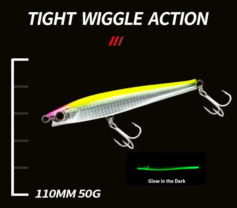 Detalles del producto: Modelo de señuelo: señuelo de pececillo Tipo de señuelo: señuelo de pesca duro Peso del señuelo: 50g Longitud del señuelo: 110mm Profundidad: profundo Flotabilidad: hundimiento Anzuelos: anzuelos triples de acero rico en carbono para nadar Ojos: ojos de pez en 3D Material: ABS Colores: 12 colores