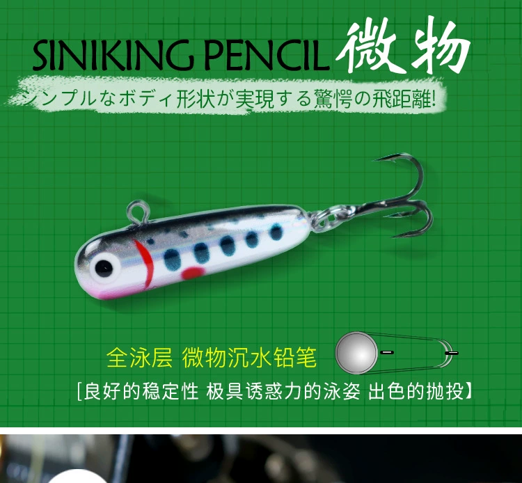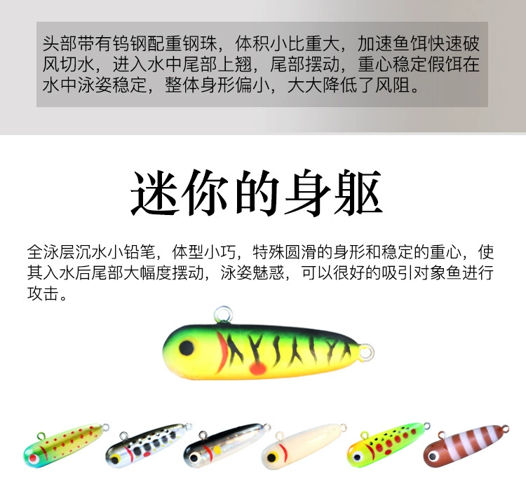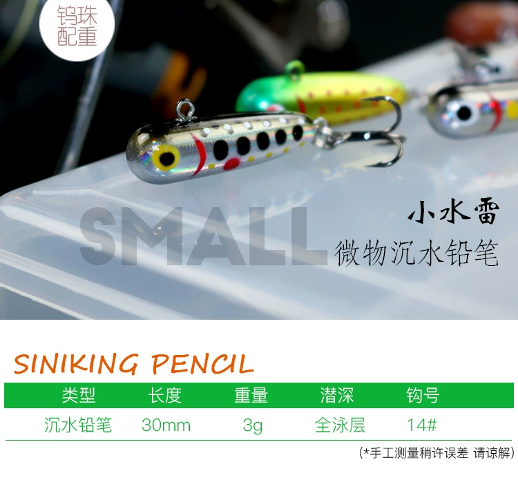 Detalles del producto:1.Tipo: señuelo duro para lápiz2.Peso: 3g3.Longitud: 3 mm4.Acción: Hundirse5. Profundidad de buceo: todos los calss6.Gancho: 4#8.Paquete: embalaje en caja individual.