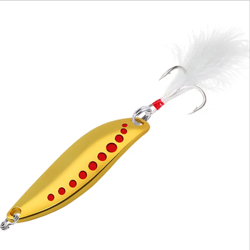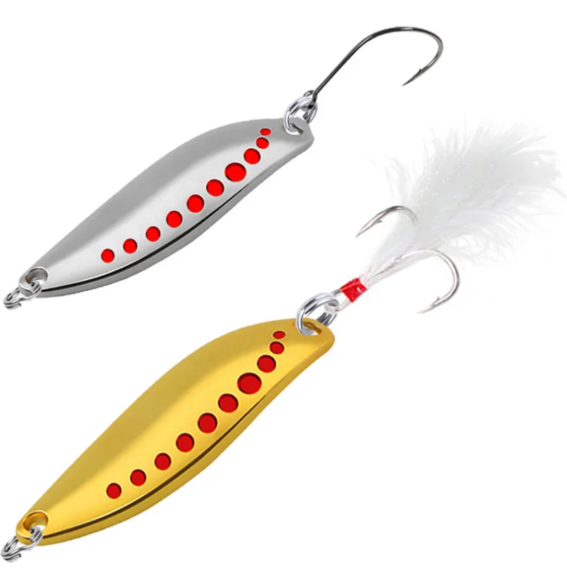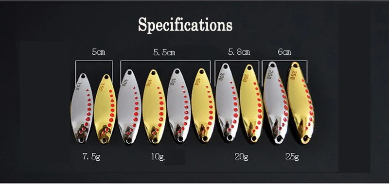 Características:Tipo de señuelo: cebo metálico de cuchara de sanguijuelaPeso: 2,5g/3,5g/5g/7,5g/10g/15g/20gLongitud: 55mmMaterial: Metal/aleación de ZincGancho: 1 gancho triple afiladoEl paquete incluye:1x1 ud. Cuchara señuelo de metal