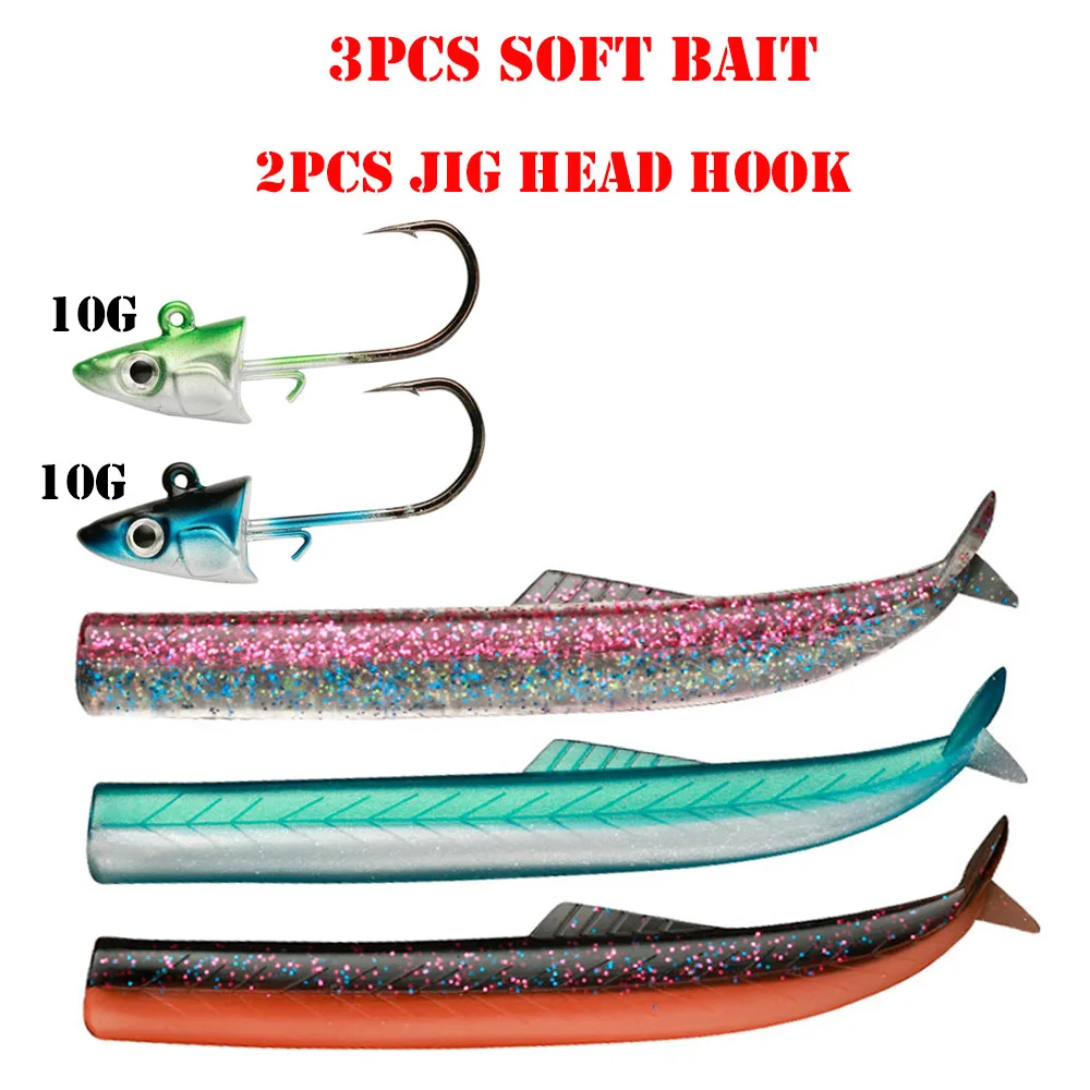 Señuelo de pesca suave, 10g, 3 piezas con anzuelo, cola artificial de Anguila de arena con anzuelo de cabeza de plantilla, cebo Artificial Minnow, lubina de agua salada
