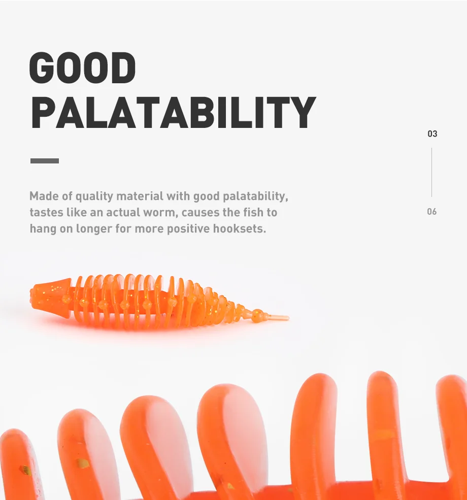 3. Buena palatabilidad-Hecho de material de calidad con buena palatabilidad, sabe como un gusano real, hace que el pescado cuelgue más tiempo para más hooksets positivos.4. extremadamente realista vida señuelo-diseño del cuerpo realista, cuerpo flexible con realista, agarrando la atención de los peces.