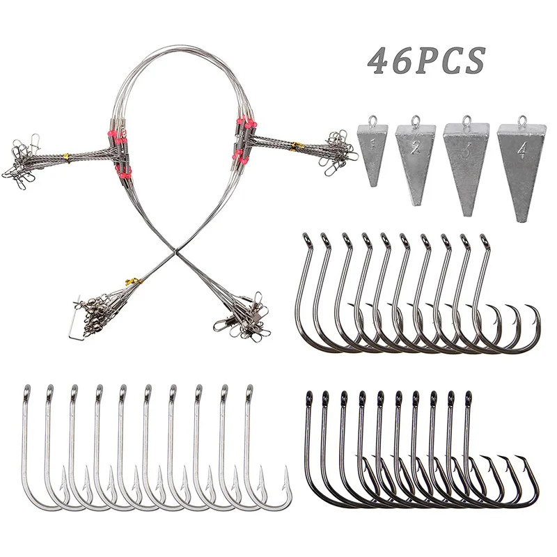 Cantidad: 46 piezas Peso del plomo: 1OZ, 2OZ, 3OZ, 4OZ Material del gancho: Gancho de acero inoxidable y gancho de acero de alto carbono Líder de alambre de pesca: Línea de acero inoxidable de 12 piezas Característica: Plomo grande, diferentes tamaños, más opciones Aparejo esencial de aparejo de pesca para juegos grandes de surf Nota: Puede haber algunos errores de medición, no se preocupe. Gracias