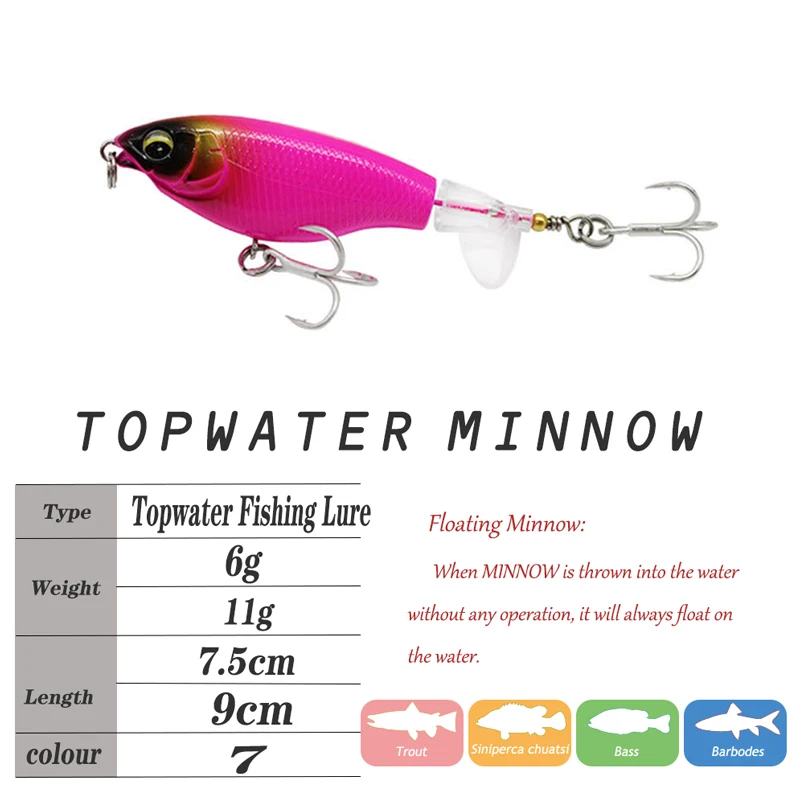 Especificaciones◆Tipo: Whopper Popper◆Longitud: 7,5 cm/11 cm◆Peso: 6 g/11 g◆Color: 7 colores◆Profundidad: Agua superior◆ Acción: Flotante
