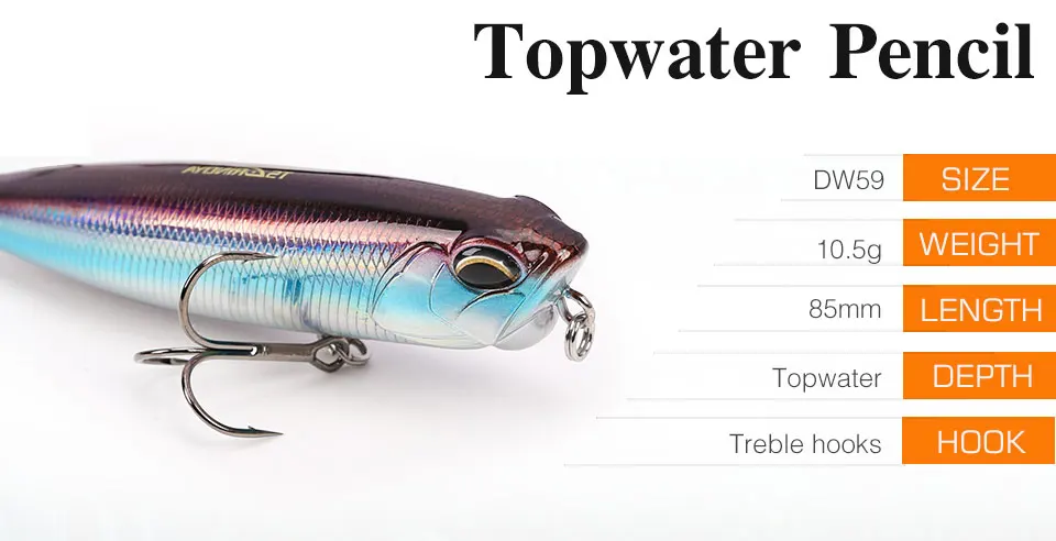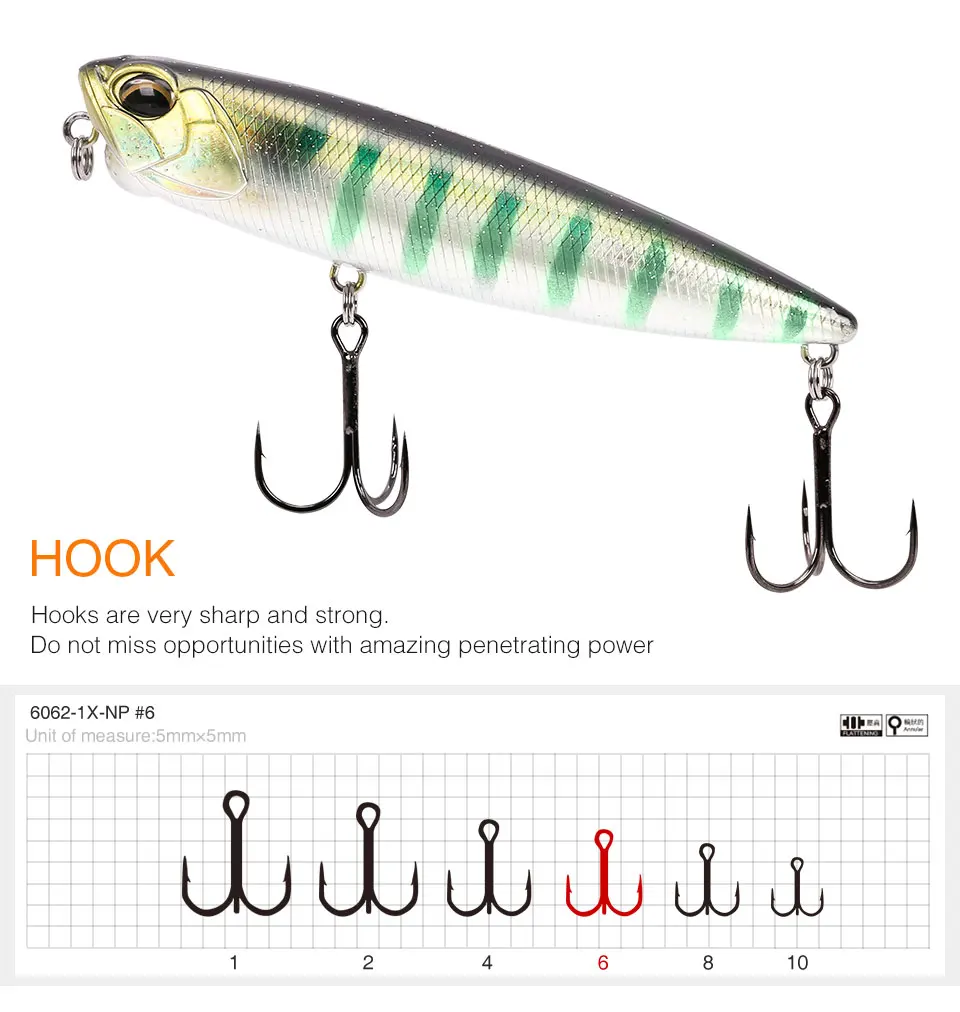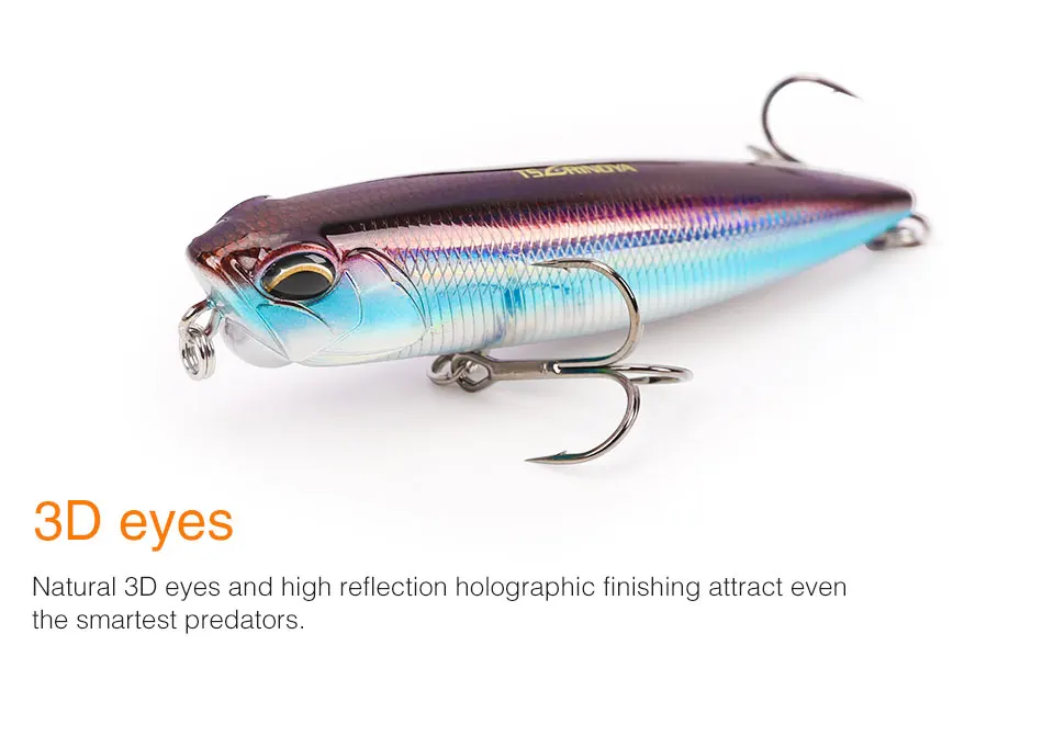 * DW59 es un señuelo de lápiz flotante de agua superior. Cuerpo fuerte, escamas de pez con efecto láser reflejan la luz desde todos los lados con maravillosa tentación.