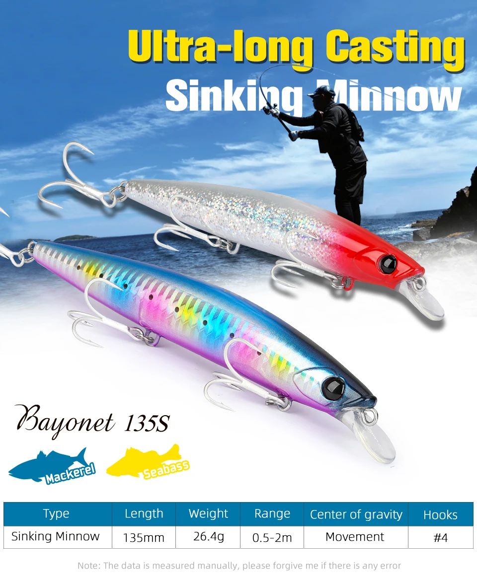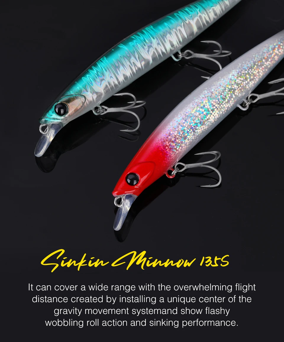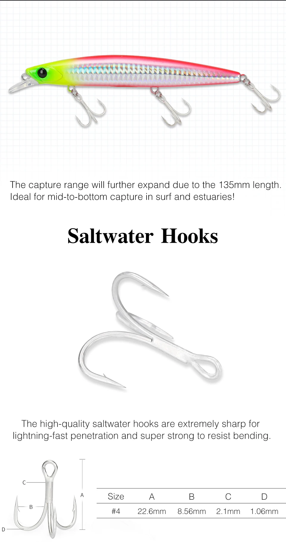 -El rango de captura se ampliará aún más gracias a la longitud de 135 mm.¡Ideal para capturar de mediados a bajos en surf y estuarios!