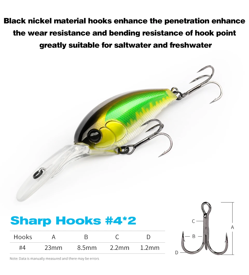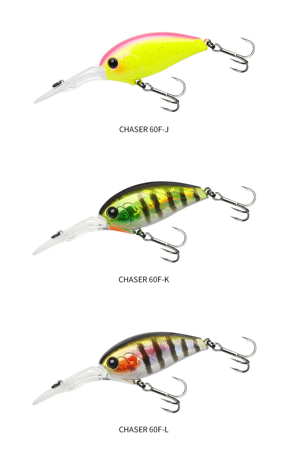 El labio alargado aumenta el área de contacto con el agua.Con una velocidad de inmersión rápida y una fuerte acción de oscilación, 60F puede alcanzar la capa de agua objetivo rápidamente incluso 3 metros y comenzar a buscar.