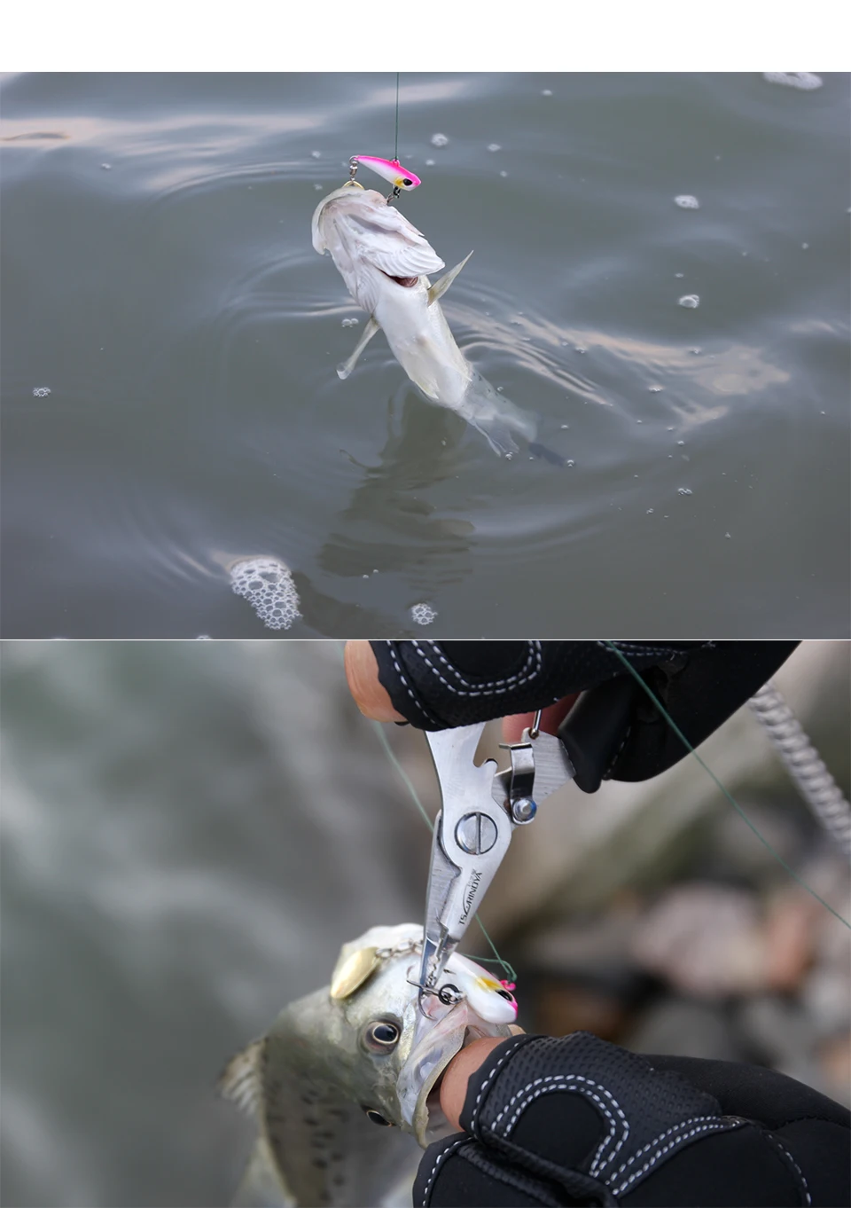 4. Abdomen con anzuelos triples de níquel negro de alta resistencia, puntas de anzuelo curvas con púas evitan que los peces se escapen.