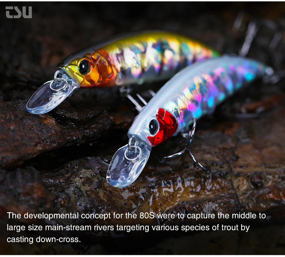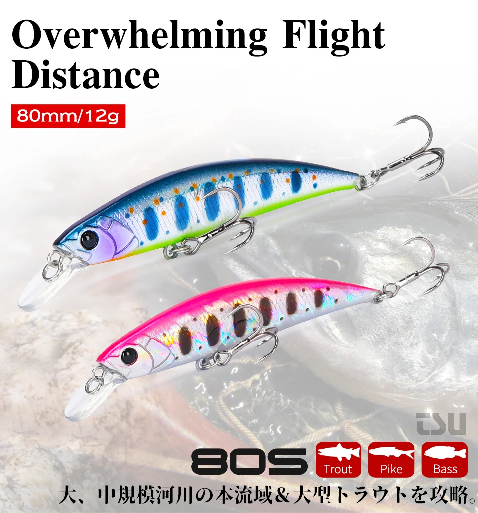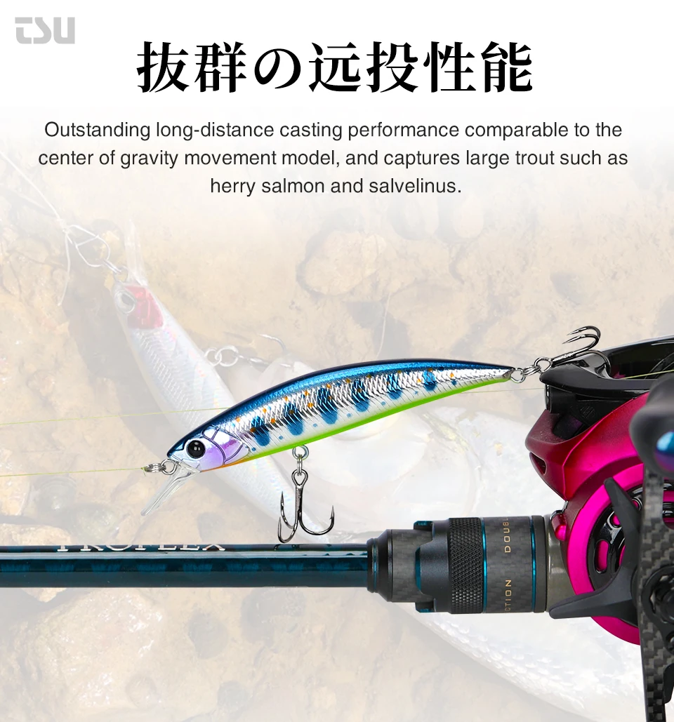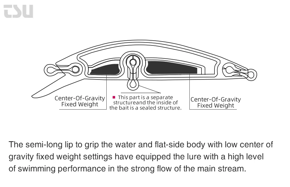 El labio es para agarrar el agua y el cuerpo del lado plano con un centro de gravedad bajo. Los ajustes de peso fijo han equipado el señuelo con un excelente rendimiento de natación en el fuerte flujo de la corriente principal.Su iniciación es rápida y capaz de manejar la contracción consecutiva a través de la varilla.